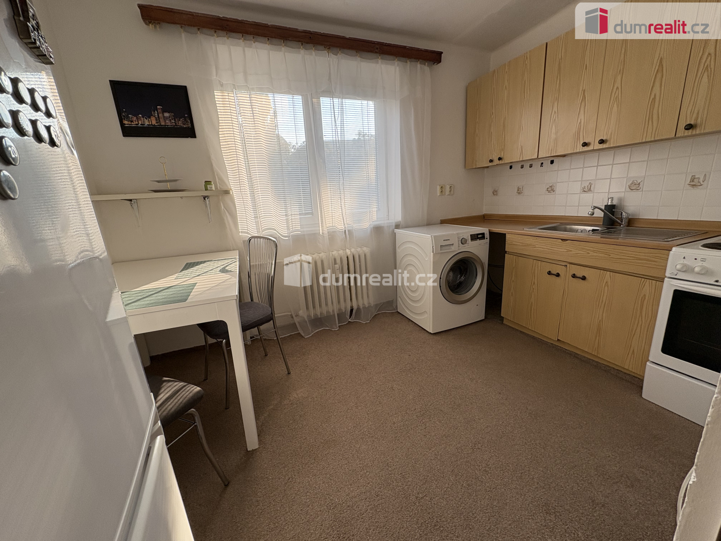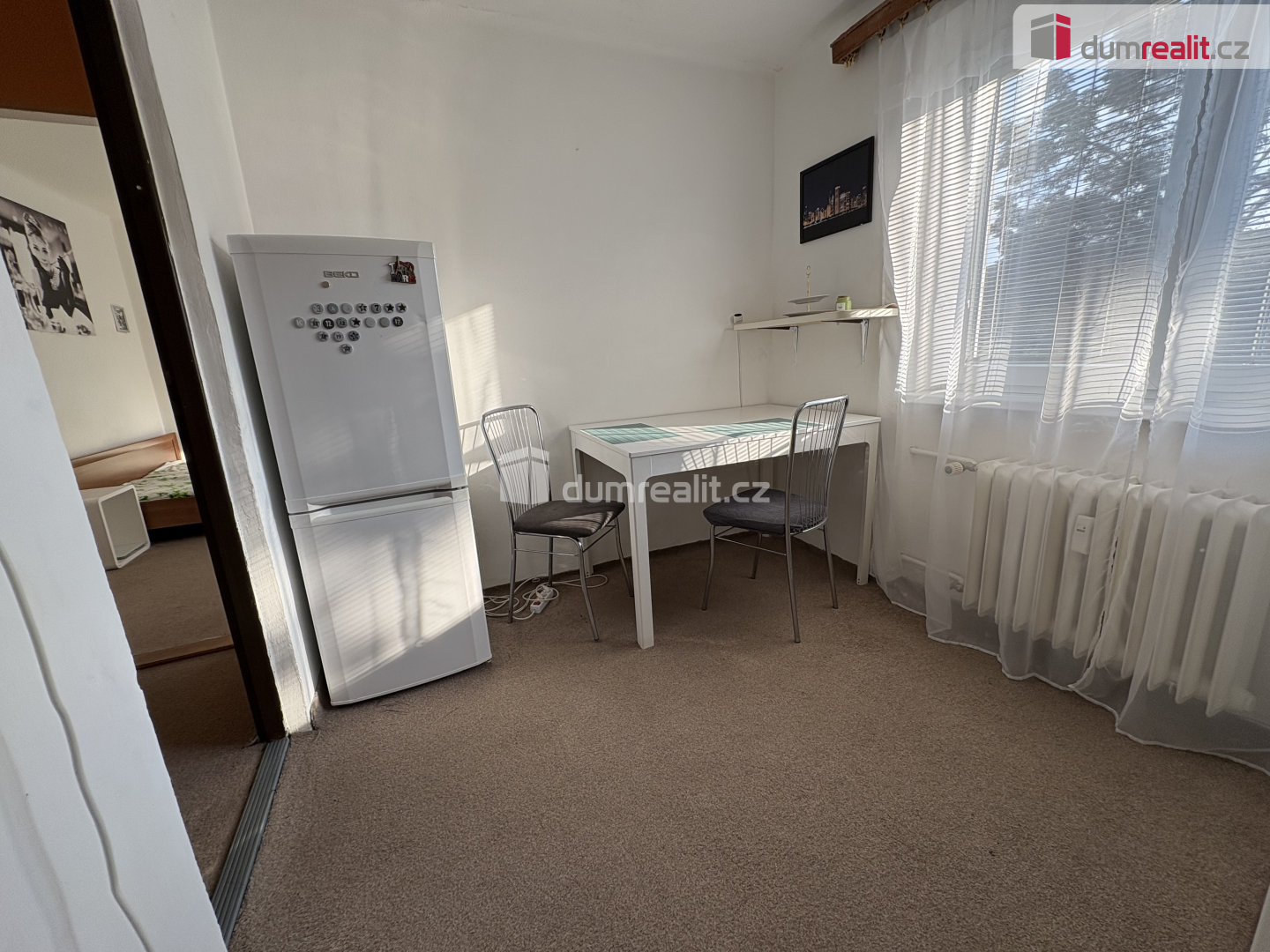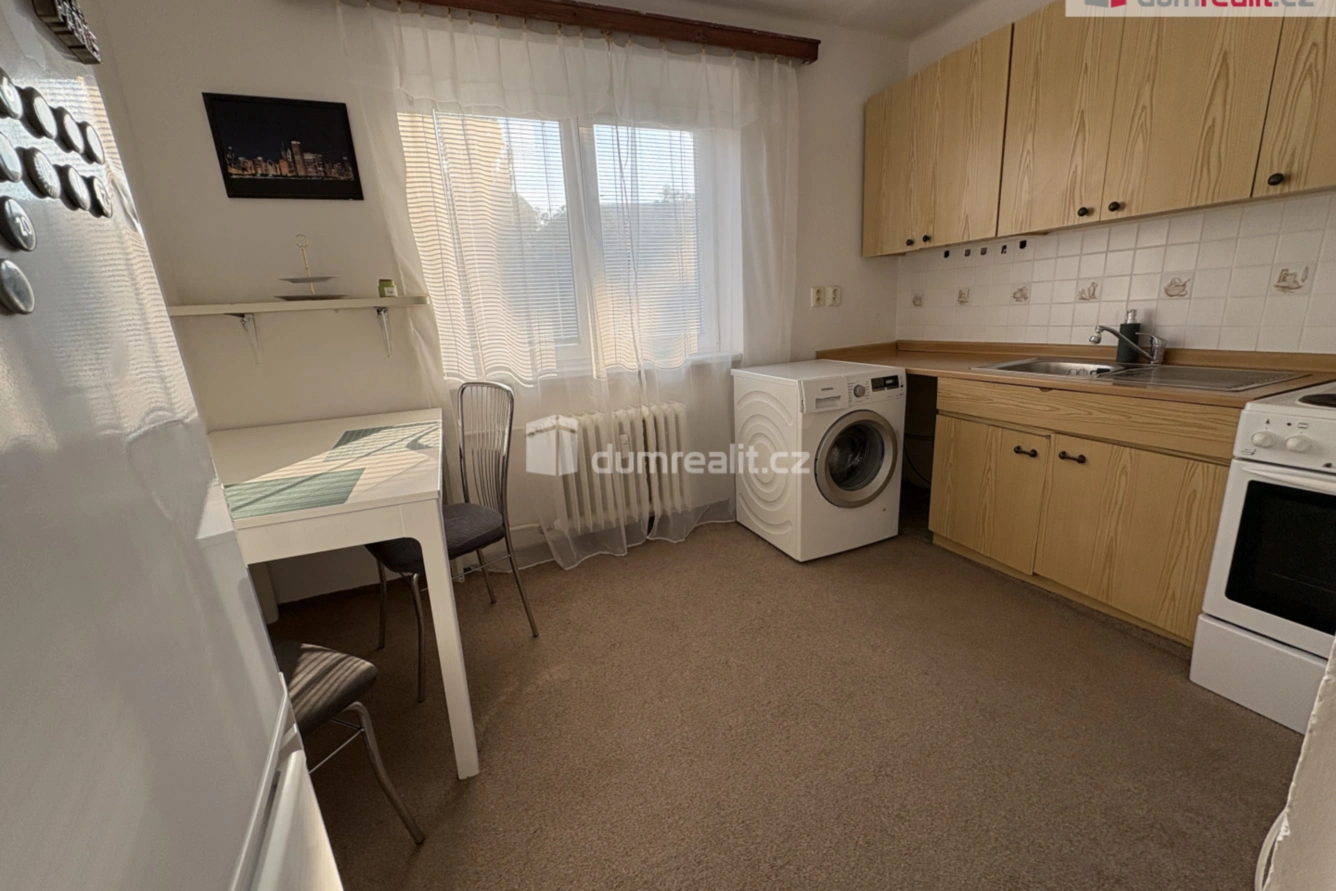 Při vstupu do bytu je po pravé straně koupelna se vanou a WC. Na proti je kuchyň, kde se nachází kuchyňská linka s elektrickým sporákem, pračka, lednice a stůl se židlemi. V samostatném pokoji je manželská postel a skříň. V bytě jsou plastová okna, topení a ohřev vody je dálkově.