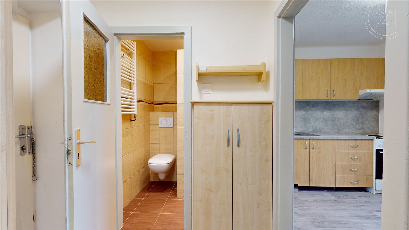 Hned při vstupu vás přivítá menší chodba, ze které se vchází do kuchyně, koupelny i hlavního pokoje.