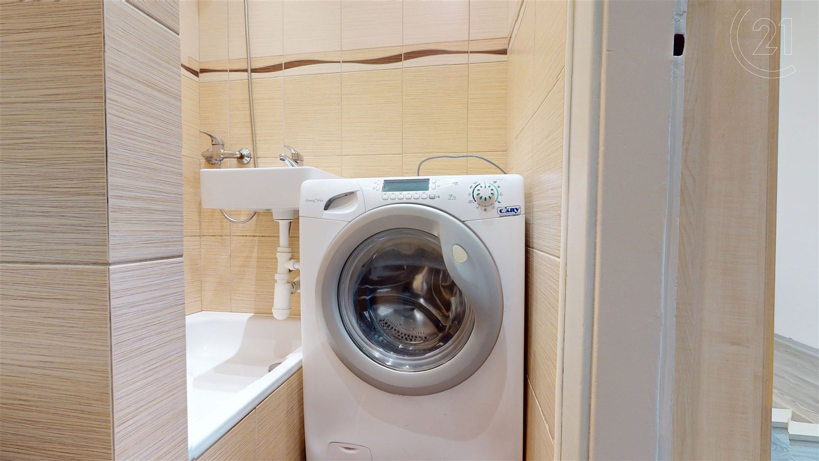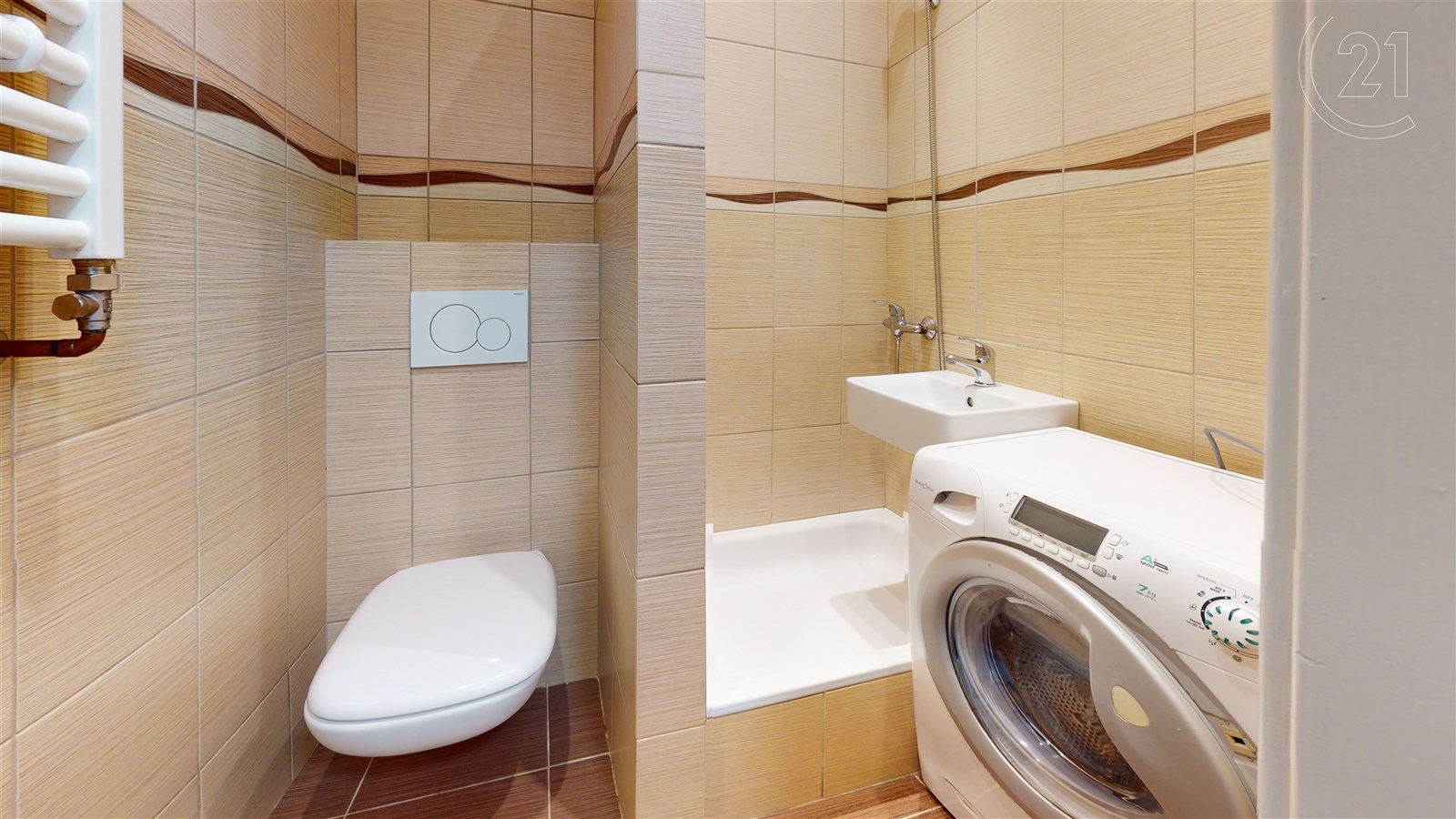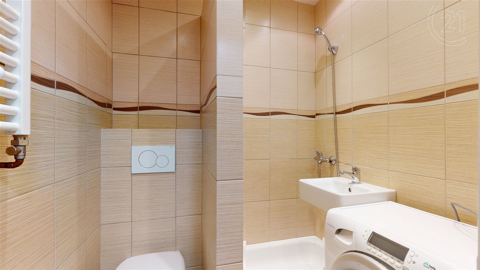 Koupelna je spojena s toaletou a najdete v ní nejen hezké kachličky, ale i pračku, která je součástí vybavení.