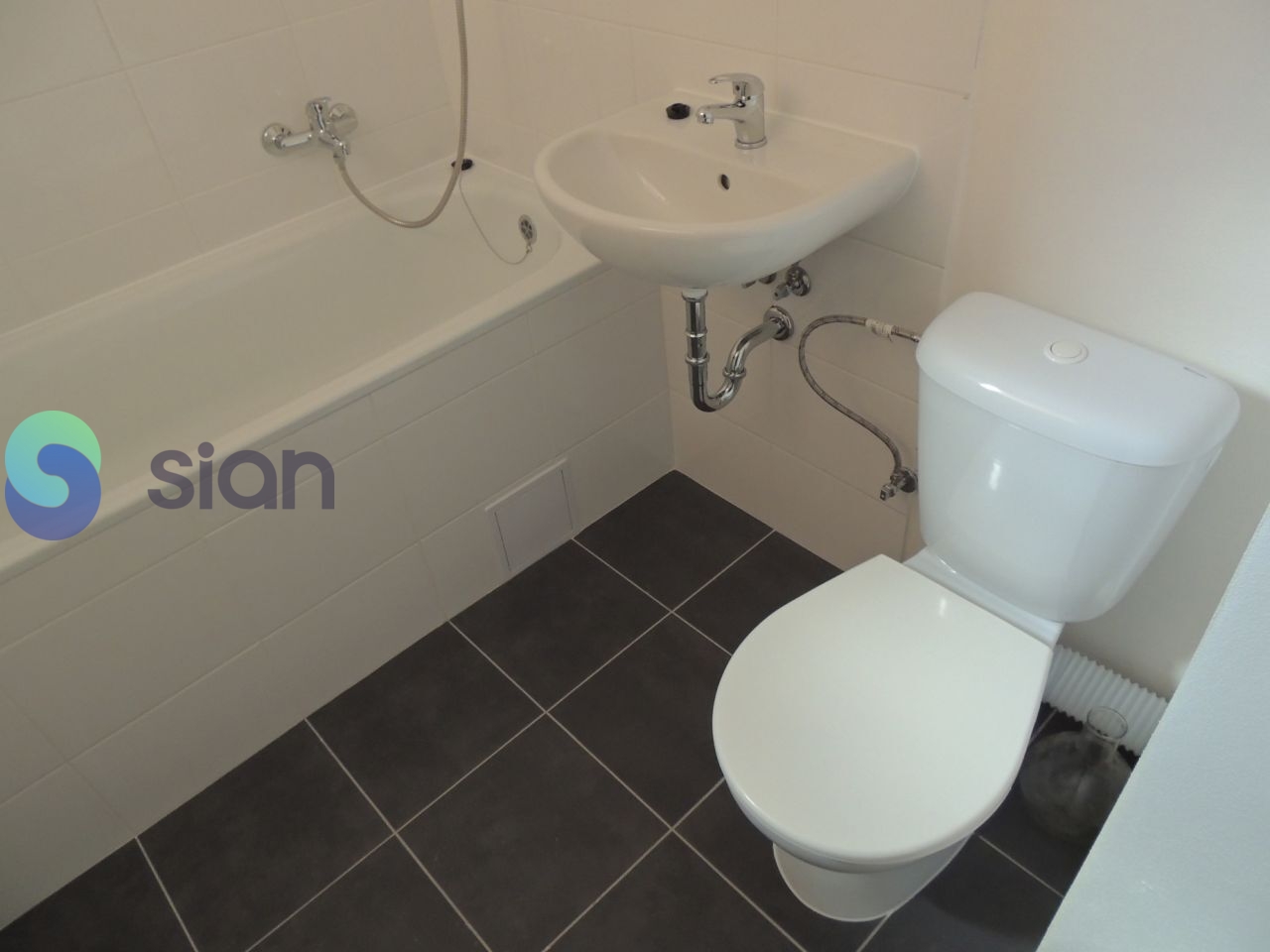 Koupelna s vanou a umyvadlem, toaleta je součástí koupelny.