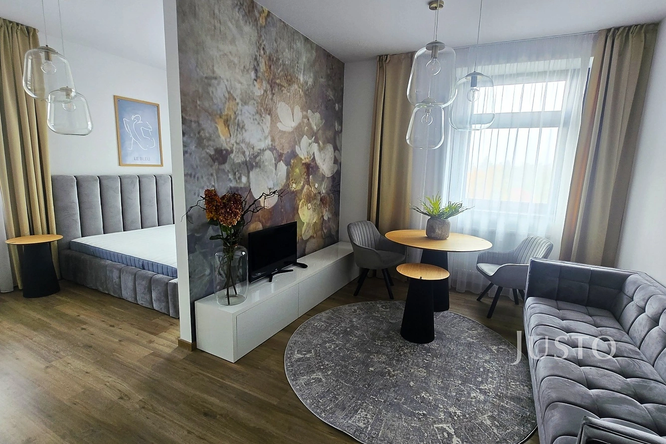 Vybavení bytu, sedací souprava, postel, šatní skříň, konferenční stolek, televizní set.  Díky vybavení a dispozici je ideální pro jednotlivce, kteří hledají komfortní a moderní bydlení bez nutnosti dalších investic.