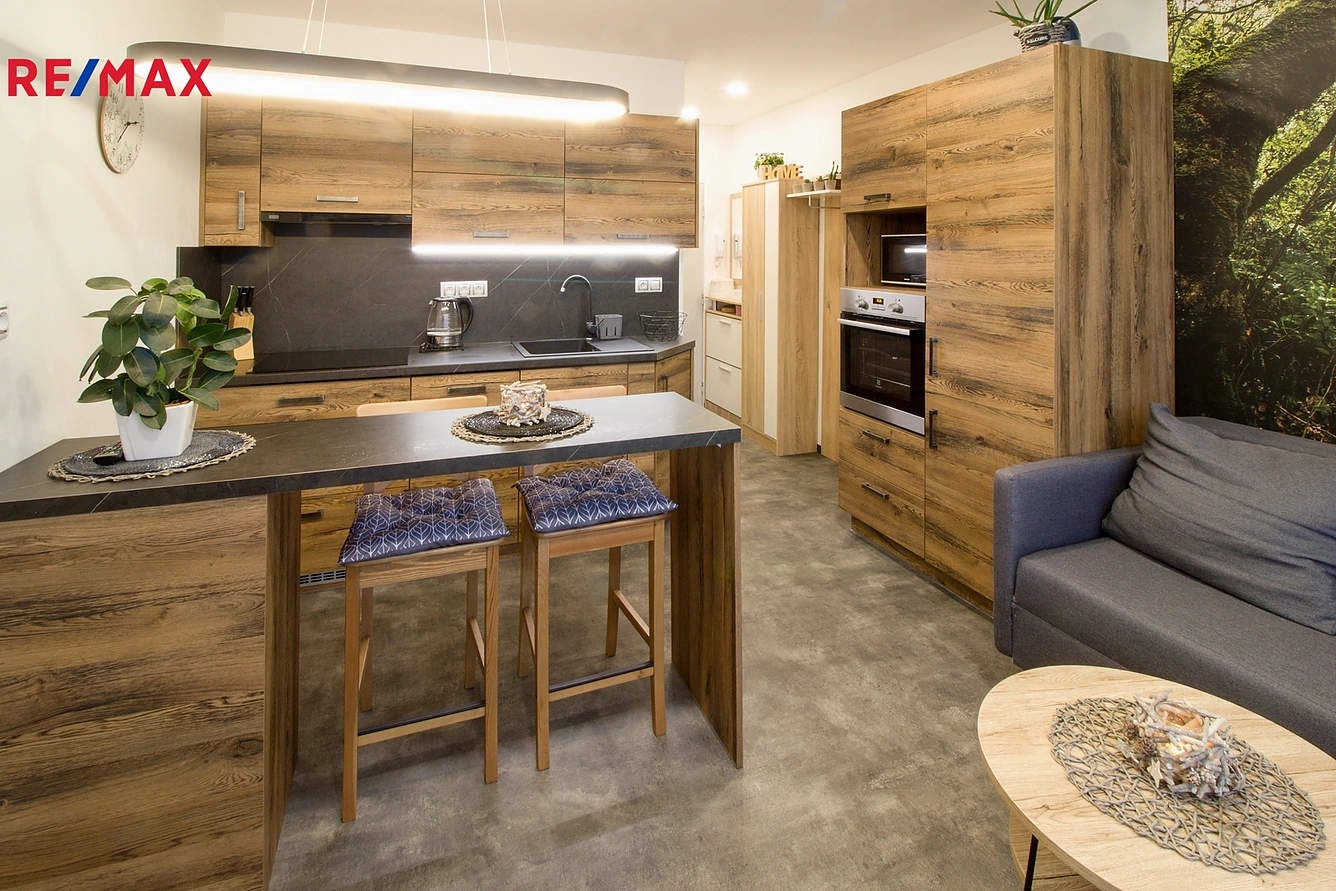 Byt prošel v roce 2020 velmi zdařilou a vkusnou kompletní rekonstrukcí – bylo vybudováno zděné jádro, koupelna s velkým sprchovým koutem, nainstalovány nové rozvody vody a elektřiny a zhotoveny nové omítky. Též došlo k zateplení prostoru kolem oken a k zateplení stropů (sádrokarton se zateplením). V pokoji byla pomocí přistavěné příčky vybudována šatna s policemi na míru, ve které je prostor a připojení pro pračku i sušičku. Veškeré dveře v bytě jsou též nové. Moderní kuchyňská linka se spotřebiči je vybudována na míru, všude v bytě byla instalována LED bodová osvětlení. Na podlahách je položeno lino, okna jsou plastová.