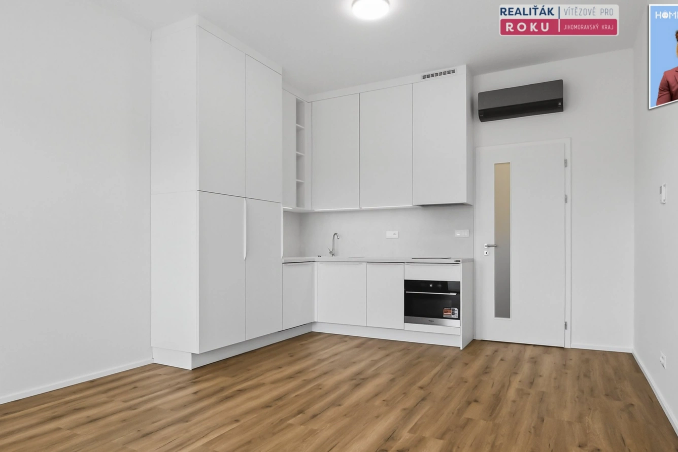 Nabízíme k pronájmu zcela nový, světlý byt 1+kk o výměře 34,1 m2 ve 3. nadzemním podlaží novostavby s výtahem na ulici Komárovská, pár minut chůze od Galerie Vaňkovky a historického centra. Lokalita nabízí kompletní občanskou vybavenost a výborné dopravní spojení, v docházkové vzdálenosti je zastávka MHD Železniční.Po vstupu do bytu vidíme předsíň s prostorem pro vestavěné úložné řešení, odkud se vchází do světlé obytné místnosti s kuchyňským koutem. Kuchyň do tvaru „L“ je zcela nová v nadčasové bílé, vybavená varnou deskou, vestavnou troubou, myčkou a digestoří. Interiér působí čistě a elegantně, na podlaze je kvalitní krytina v dekoru dřeva a komfort doplňuje klimatizace.Z obytné části se vychází na balkon orientovaný do klidného vnitrobloku se zelení a dětským hřištěm, takže vás neruší městský provoz. Velkoformátové balkonové dveře orientované na východ přivádějí do interiéru dostatek denního světla, ráno a dopoledne sem proudí přímé slunce a po poledni příjemné rozptýlené světlo ideální na snídani na balkonu i klidný odpolední home office. Okna jsou osazena venkovními elektrickými žaluziemi pro soukromí a lepší tepelný komfort.Koupelna a WC jsou oddělené; v koupelně je sprchový kout a místo na pračku. Díky standardu novostavby lze očekávat nízké provozní náklady a bezstarostné bydlení.Nájemné činí 16 900 Kč měsíčně, k tomu zálohy na energie a služby 2000 Kč. Vratná kauce je 33800 Kč. Provize RK odpovídá jednomu měsíčnímu nájmu + DPH.V případě zájmu mě prosím kontaktujte, poskytnu další informace a domluvíme si termín prohlídky.
