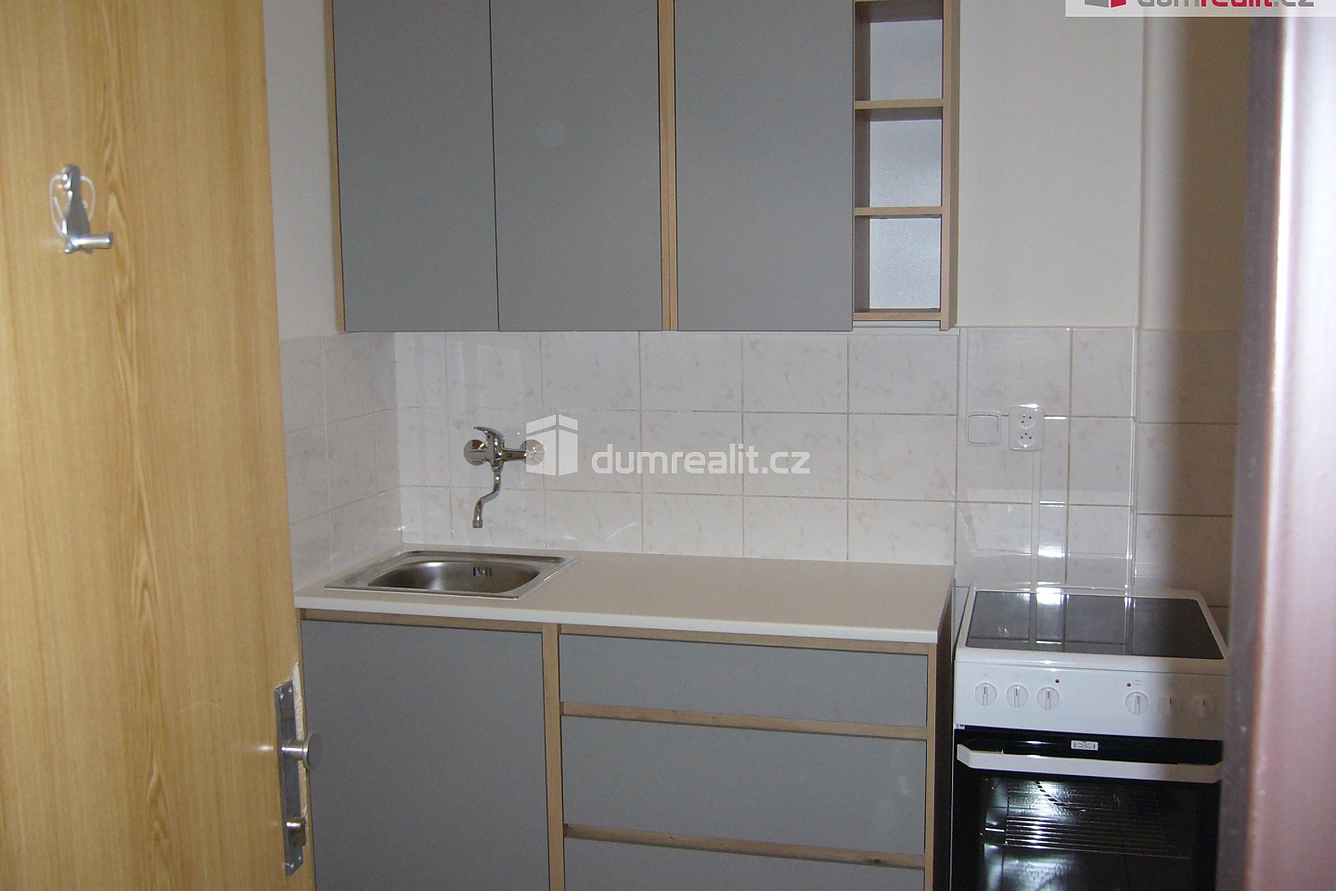 Dispozice bytu: vstupní prostor s novou kuchyňkou a sporákem, menší koupelna se sprchovým koutem a samostatným WC, 1 x prostorný pokoj.