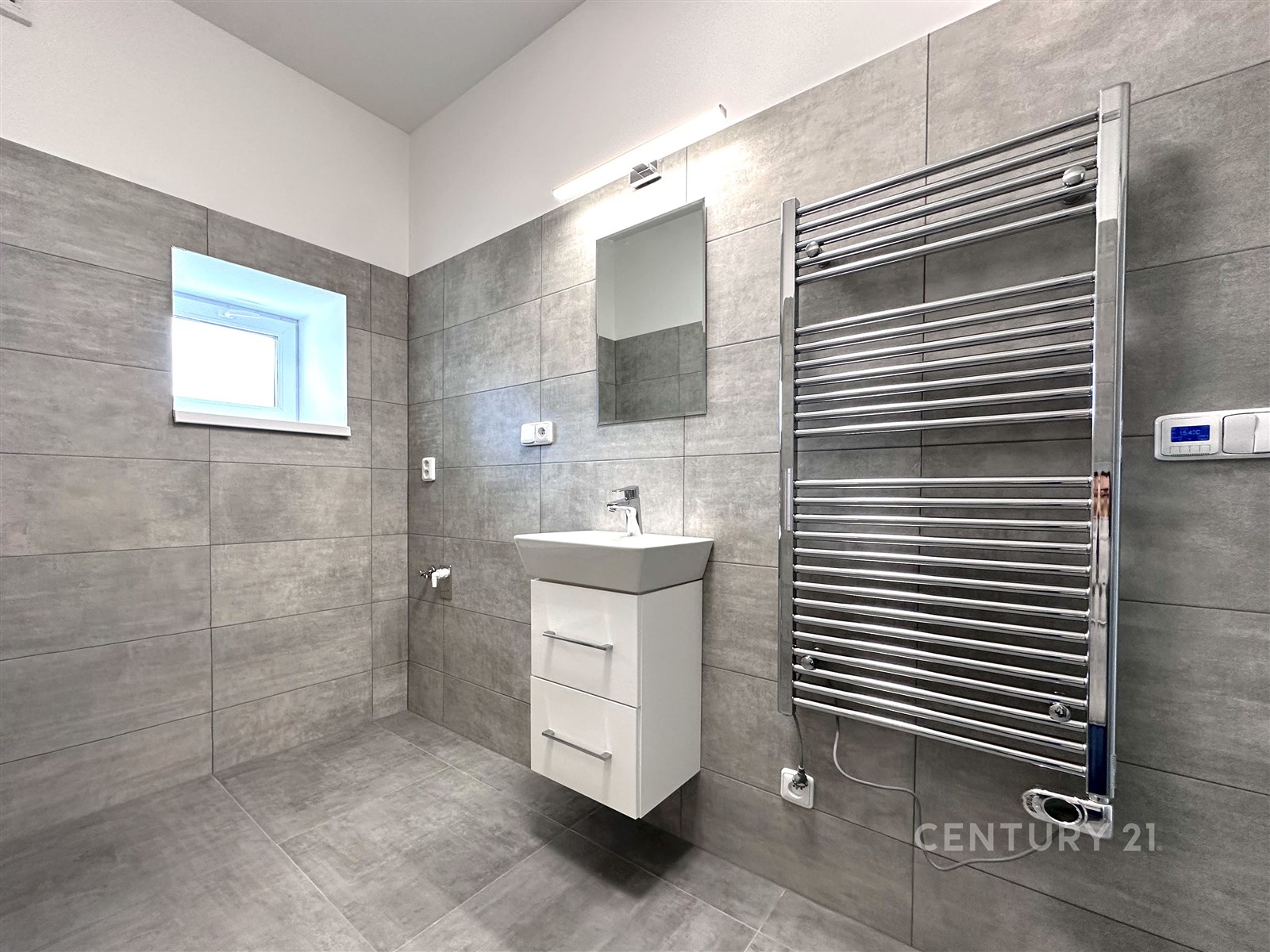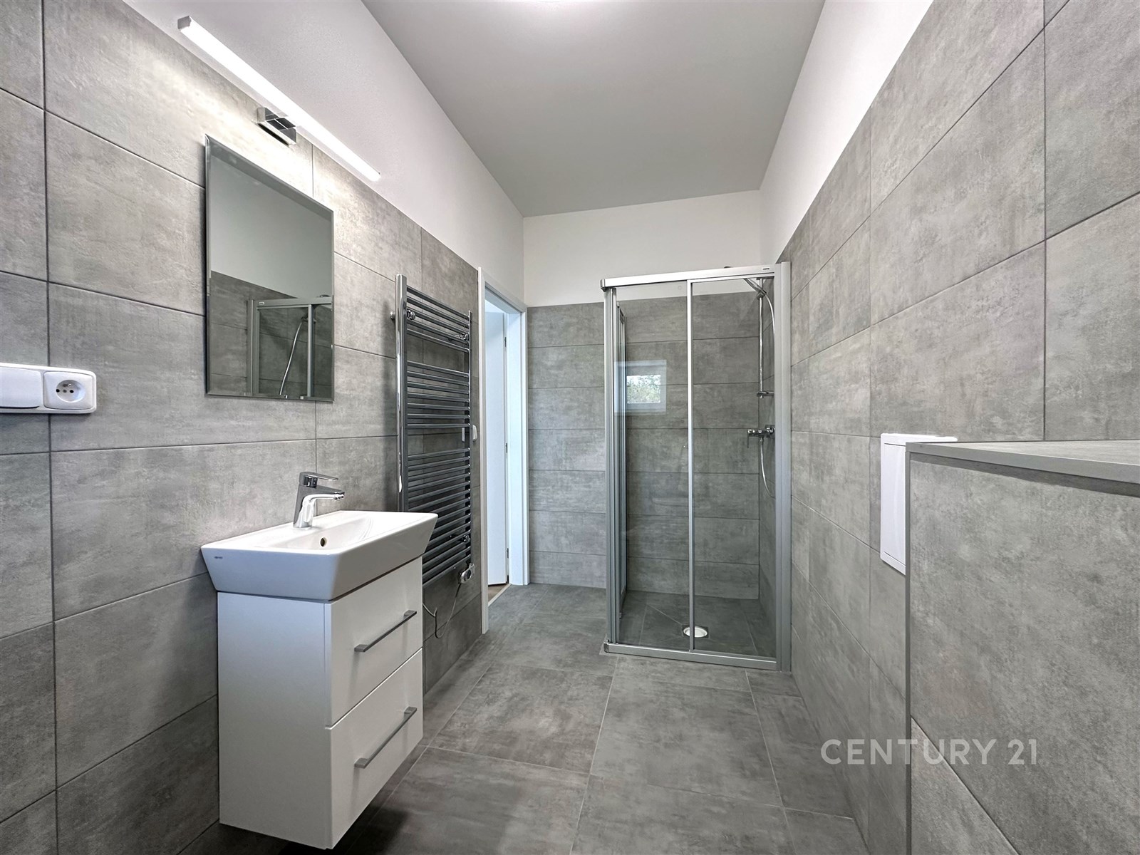 Velkou předností bytu je prostorná předsíň se vstupem na rozlehlý balkon s výhledem do okolí. Koupelna je laděna do moderní šedé dlažby, se sprchovým koutem a osvětlením nad zrcadlem.