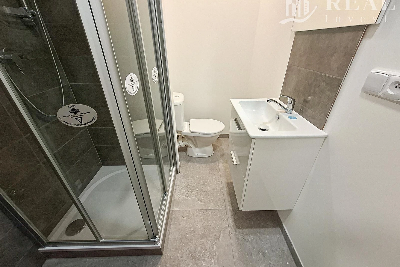 Dispozice bytu: obytná místnost s kuchyňským koutem, zděná koupelna se sprchovým koutem, umyvadlovou skřínkou a WC.