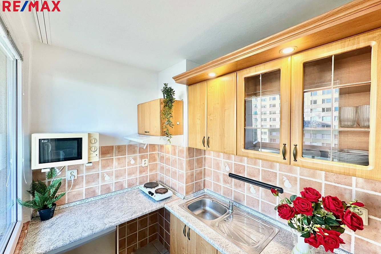 ? Byt se skládá z pokoje, kuchyně, koupelny s WC a sprchovým koutem, vstupní chodby a lodžie. Samostatně na patře je prostorná komora (1,7 m²), kam si uložíte třeba kolo, a dole v přízemí je sklepní kóje (1,2 m²). Byt je vybavený kuchyňskou linkou s elektrickým vařičem a mikrovlnnou troubou. Dále je v kuchyni k dispozici chladnička. V rámci modernizace byla položen nový koberec v pokoji, vymalován celý byt a instalovány nové elektrorozvody v kuchyni a v koupelně.