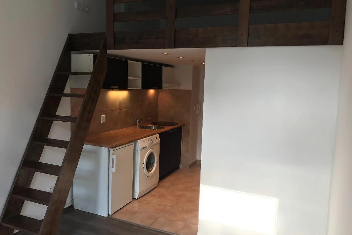 Majitel zrekonstruovaného domu nabízí k pronájmu klidný a slunný byt o dispozici 1+kk s patrem na spaní, orientovaný do vnitrobloku. Celková plocha bytu činí 18 m + 7 m patro.