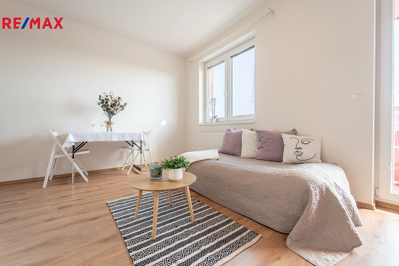 Dominantou je světlý obytný prostor s francouzskými dveřmi vedoucími na jihovýchodně orientovaný balkón (4,8 m²), odkud je krásný výhled do okolí.