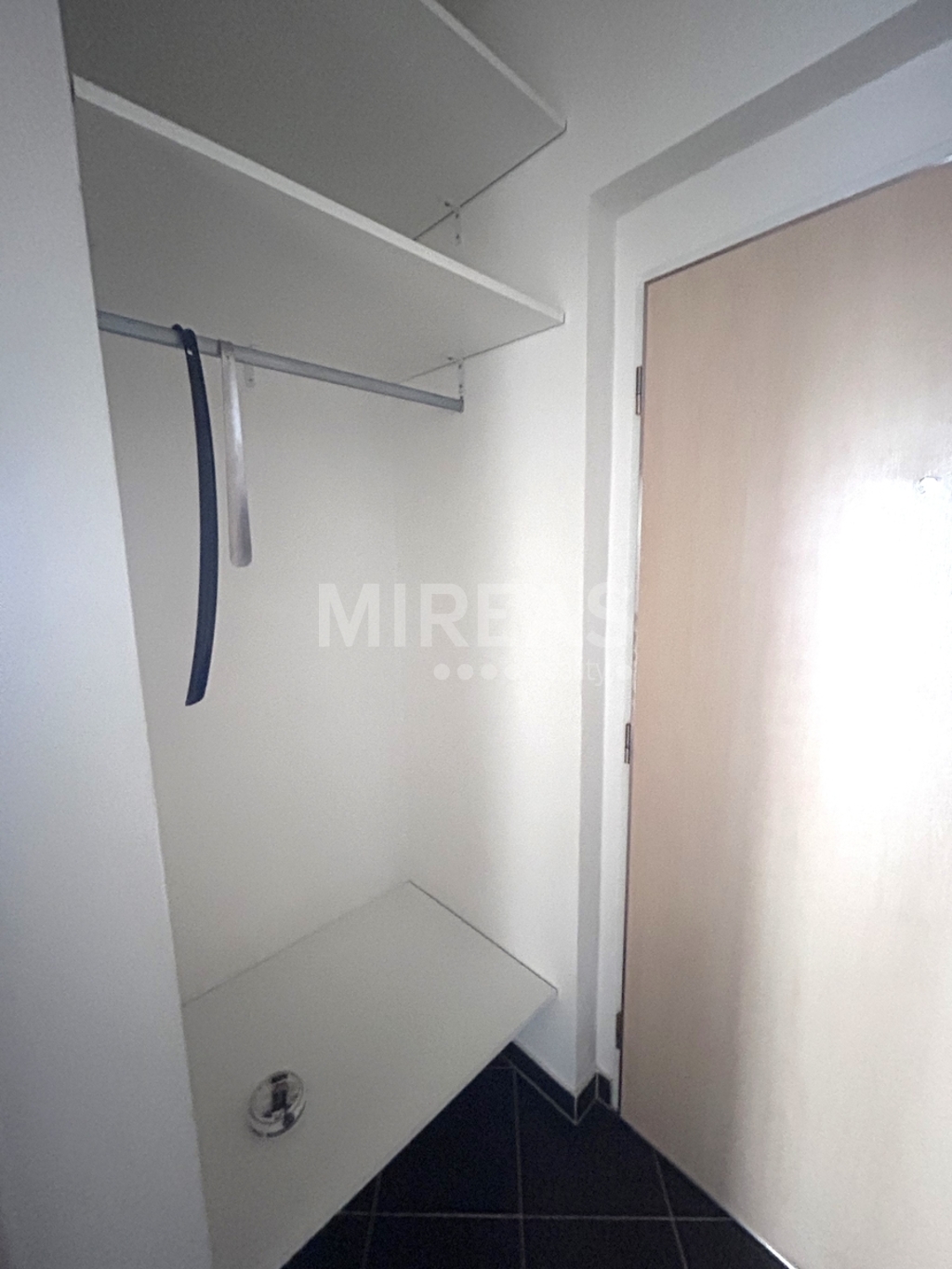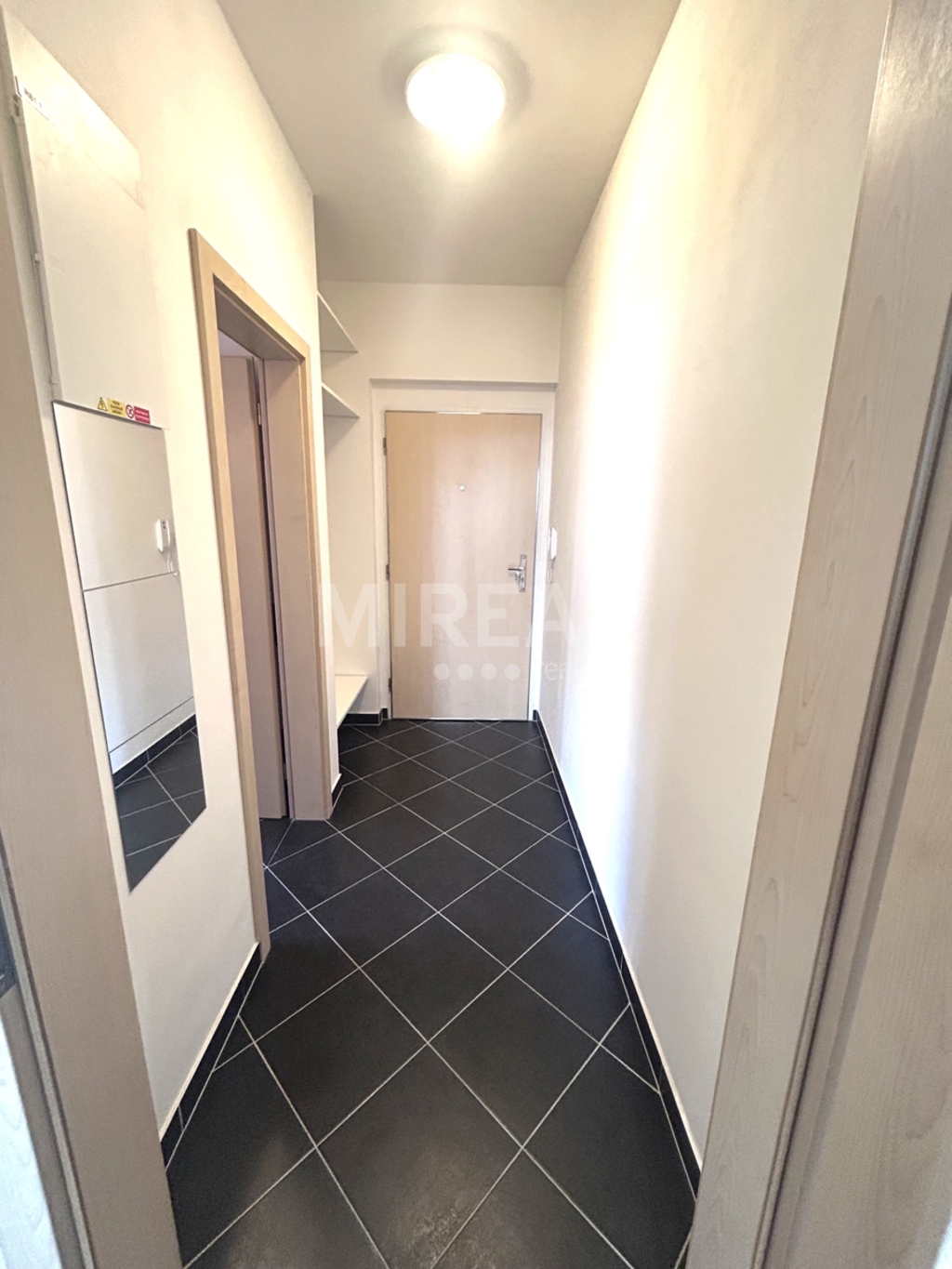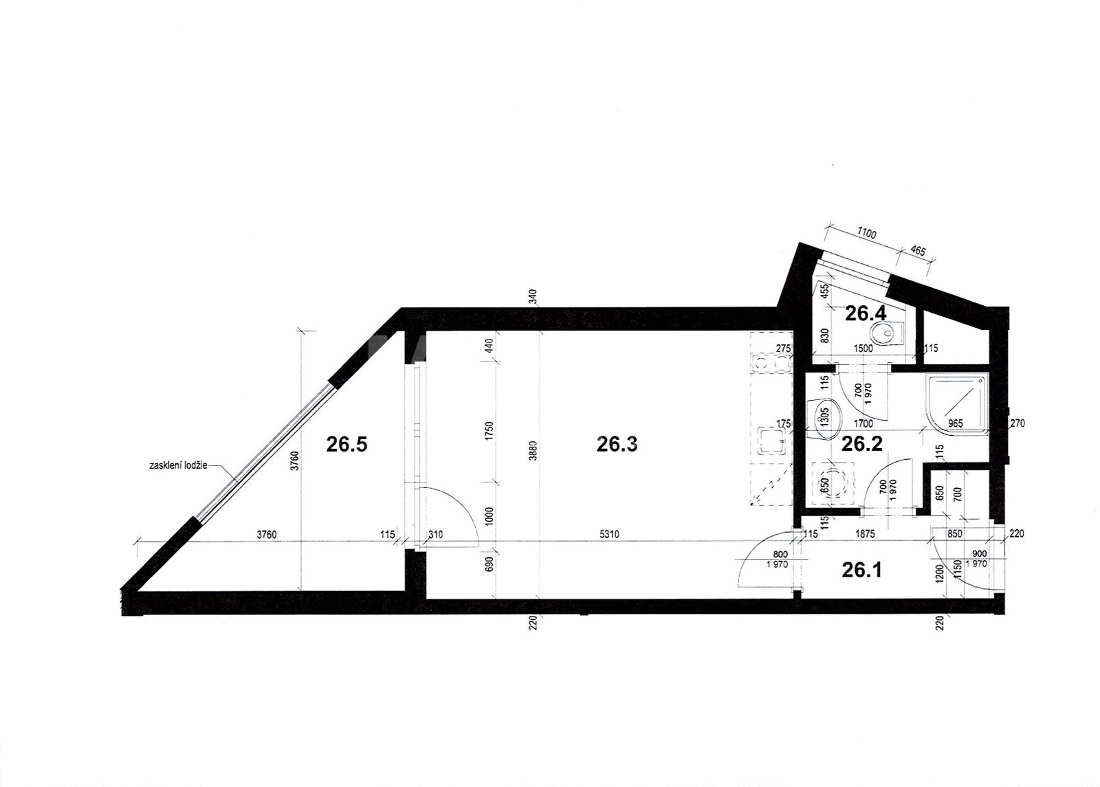 Dispozice jednotky: vstupní chodba, po pravé straně úložný prostor, navazuje koupelna se sprchovým koutem a umyvadlem, uvnitř koupelny samostatně uzavíratelné WC s oknem. Dále z chodby navazuje vstup do obývacího pokoje s kuchyňským koutem, dále výstup na prostornou zasklenou lodžii.