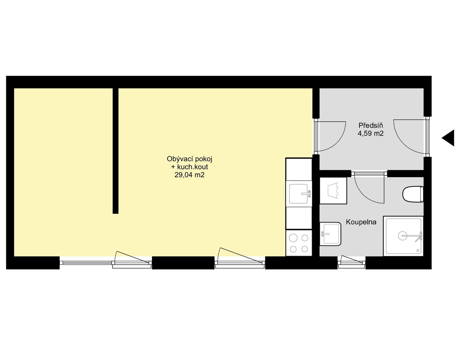 Byt je částečně zařízený: kuchyňská linka se spotřebiči (indukční varná deska dvojvařič, elektrická trouba, lednice, myčka na nádobí), vestavěná skříň v pokoji, koupelna se sprchovým koutem a s WC, pračka se sušickou. Byt nabízí dostatek světla díky francouzským oknům až k zemi s orientací na západ, francouzské okno je také umístěno v koupelně. K bytu náleží sklepní kóje 2,5 m2 a garážové stání v suterénu domu. Vytápění bytu tu je poskytováno v rámci domu.
