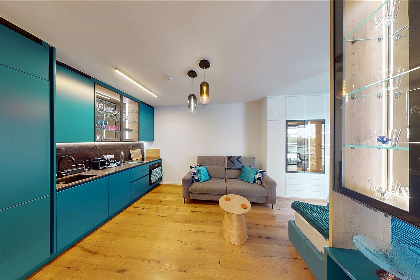 Představujeme zcela nový a nadstandardně zařízený byt o dispozici 1+kk s balkonem, 43 m2 v novostavbě projektu Hagibor společnosti Crestyl.