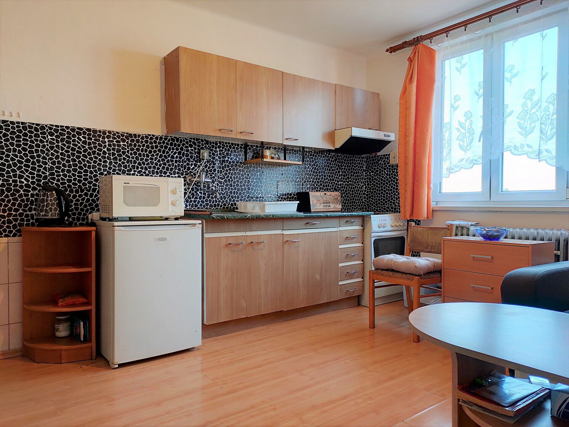 V bytě je kuchyňská linka, malá lednice s mrazákem, elektrický sporák se sklokeramickou deskou, jinak bez nábytku.