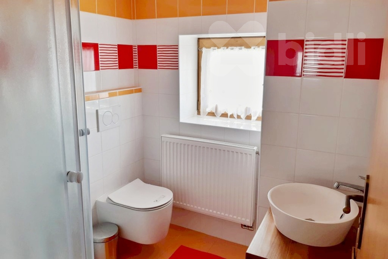 Byt je vytápěný tepelným čerpadlem, ohřev vody řešen bojlerem.