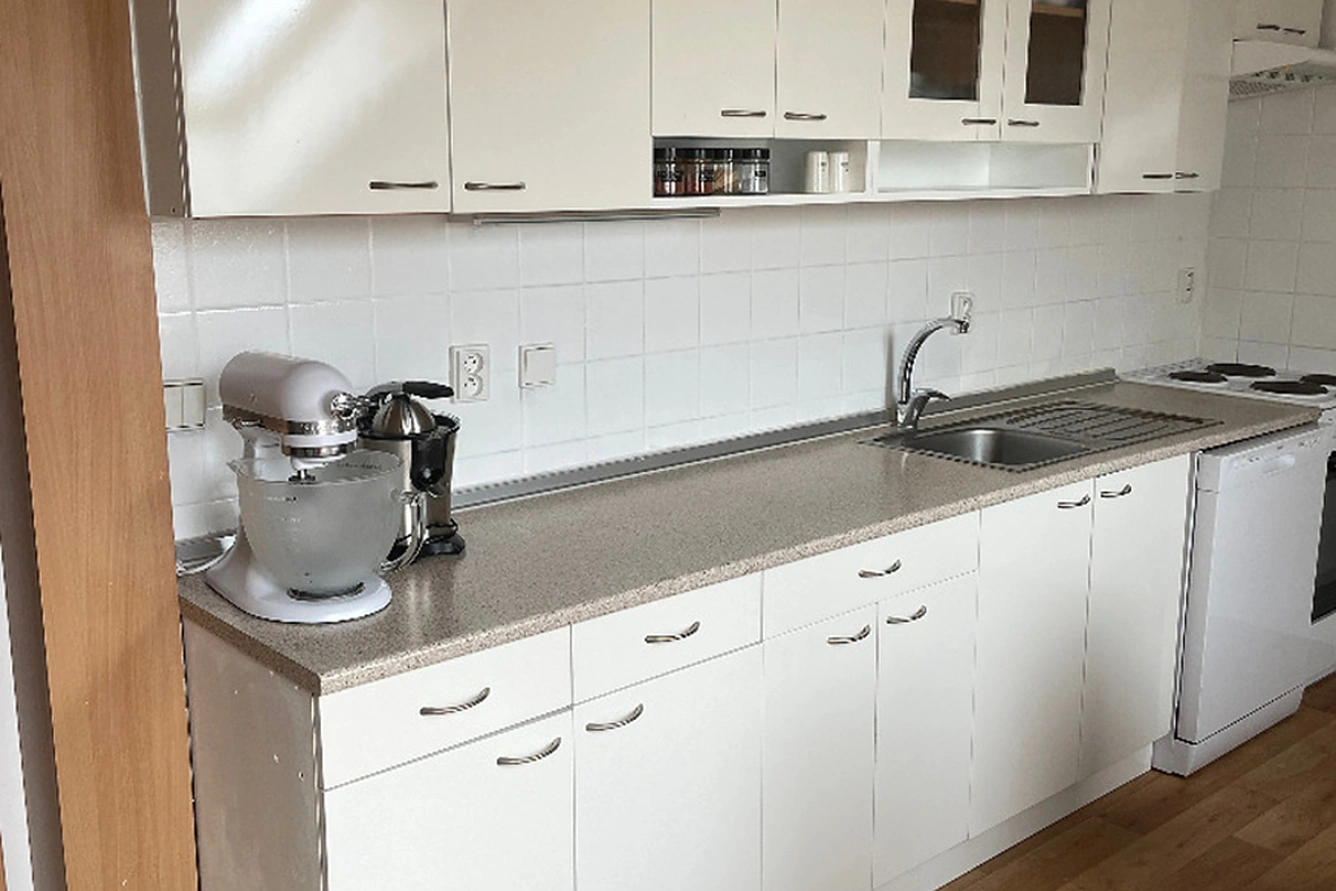Při vstupu do bytu zaujme prostorná předsíň s vestavnou šatní skříní, z předsíně je samostatný vstup do koupelny, WC , kuchyně s jídelním koutem a obývacího pokoje, z něhož se vchází do ložnice (viz. půdorys bytu). V kuchyni je kuchyňská linka s digestoří, myčkou nádobí a elektrickým sporákem. Součástí bytu je klimatická jednotka.