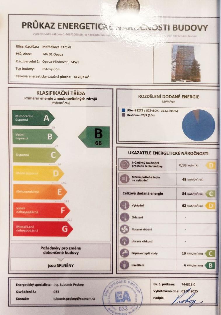 Nabízíme pronájem pěkného bytu 2+1 se dvěma balkóny na ul. Mařádkově v Opavě. Byt v osobním vlastnictví o výměře 54 m2 je situován v 5. NP zatepleného panelového domu v centru města. Je po částečné rekonstrukci, okna jsou plastová. Z prostorného obývacího pokoje i ložnice lze vejít na dlouhý balkón orientovaný na východ, v kuchyni je téměř nová kuchyňská linka se sporákem s plynovou varnou deskou a lednička. Z kuchyně je vstup na menší balkón. V předsíni je vestavěná skříň, koupelna se sprchovým koutem, umývadlem a místem pro pračku. WC je samostatné. K bytu přísluší sklepní kóje v suterénu domu. V blízkosti se nachází zastávky MHD a kompletní občanská vybavenost.