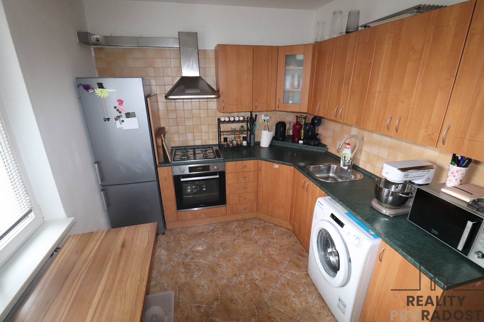 Kuchyňská linka je včetně el. trouby, plynové varné desky a pračky.