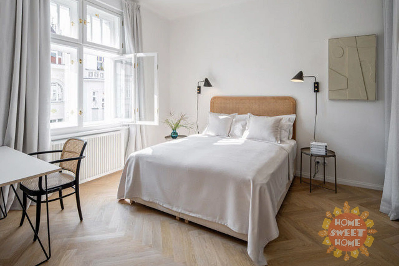 Byt disponuje jednou ložnicí, oddělenou šatnou, koupelnou se sprchovým koutem a toaletou a plně vybavenou kuchyní (kuchyňská linka s na míru vyráběnou betonovou kuchyňskou deskou včetně lednice s mrazákem, sklokeramická varná dvoj-deska, elektrická trouba, myčka, kávovar, kombinovaná pračka se sušičkou). V prostorném obývacím pokoji najdete původní a funkční kachlová kamna a jídelní kout. Zabezpečovací systém je samozřejmou součástí vybavení tohoto bytu. Součástí nájemného je úklid 1x týdně a internet.