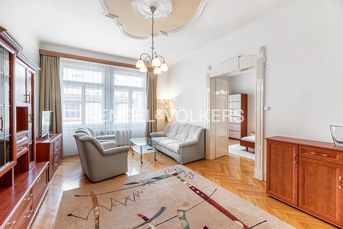 Byt se nachází v krásném historickém činžovním domě přímo u Vltavy a Palackého náměstí. Reprezentativní společné prostory s výtahem vedou ke světlému bytu ve třetím nadzemním podlaží. V bytě je prostorná chodba, ze které je přístup do dvou samostatných pokojů, kompletně vybavené kuchyně, koupelny a oddělené toalety. Podlahy tvoří dubové parkety a dlažba. Vše izolují od hluku repasovaná špaletová okna.