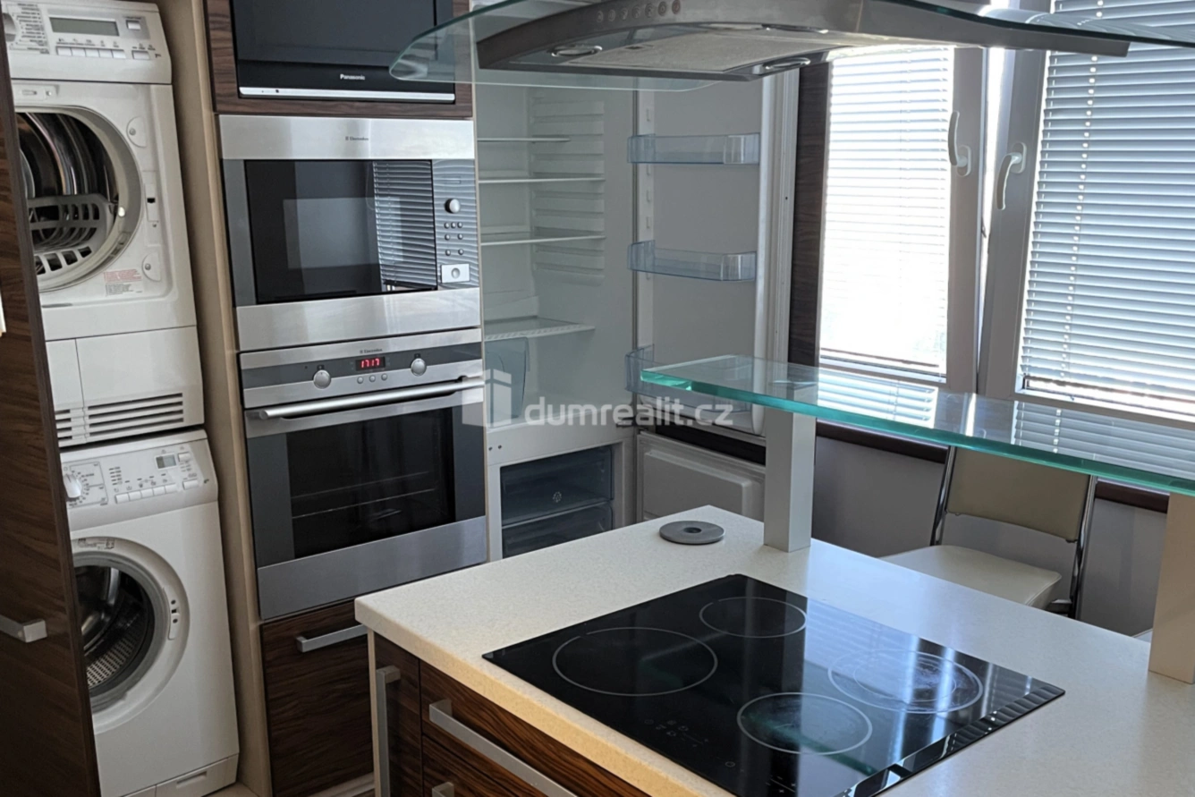 Kuchyně je plně vybavena spotřebiči: k dispozici je lednice, varná deska, digestoř, mikrovlnná trouba, myčka nádobí, pračka, sušička, barový pult a také televize. V ložnici najdete vestavěné skříně, komodu, manželskou postel s nočními stolky. Obývací pokoj nabízí jídelní stůl se židlemi, pohodlnou sedací soupravu, konferenční stolek a skříňku pod televizi; v šatně pak další vestavěné skříně.
