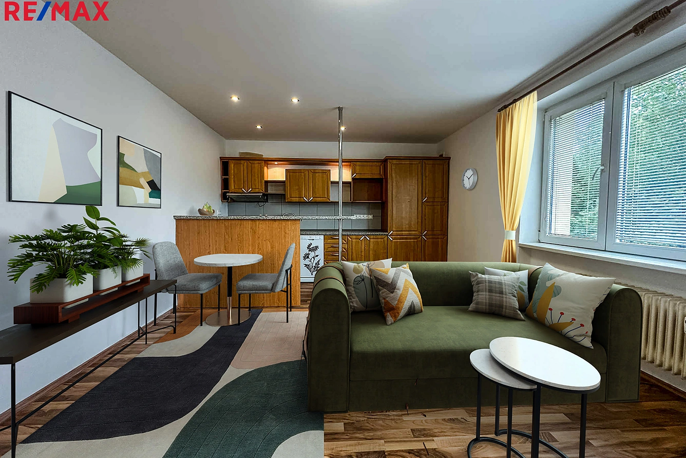 Dispozice bytu: prostorná vstupní chodba s vestavěnou skříní, koupelna s WC, ložnice a obývací pokoj s vybaveným kuchyňským koutem. K bytu náleží sklepní kóje.