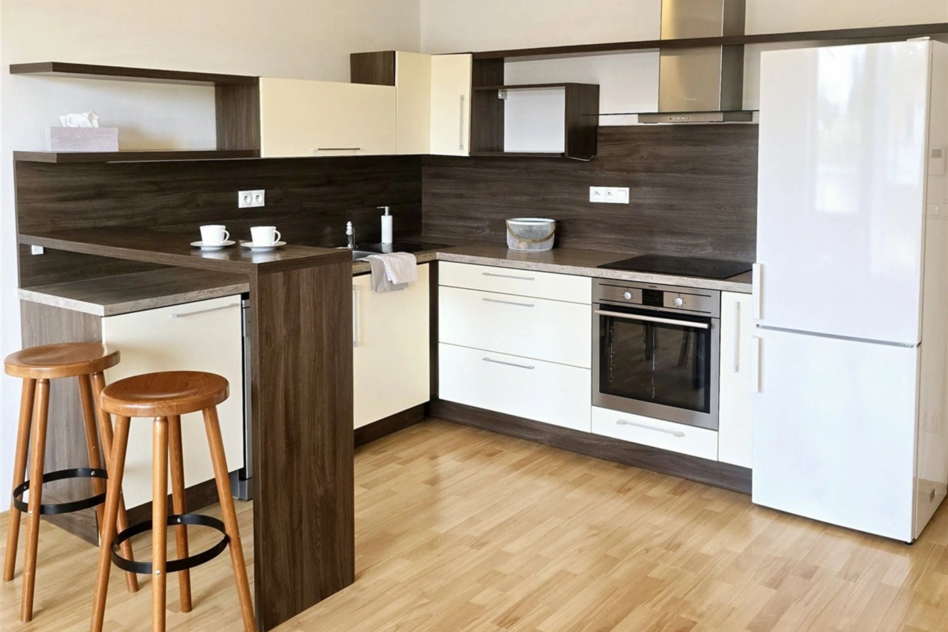 Kuchyně s moderní linkou a s barovým pultem s 2 ks barových židlí je vybavena: elektrickým sporákem a troubou, digestoří, myčkou a samostatně stojící lednicí s mrazákem.