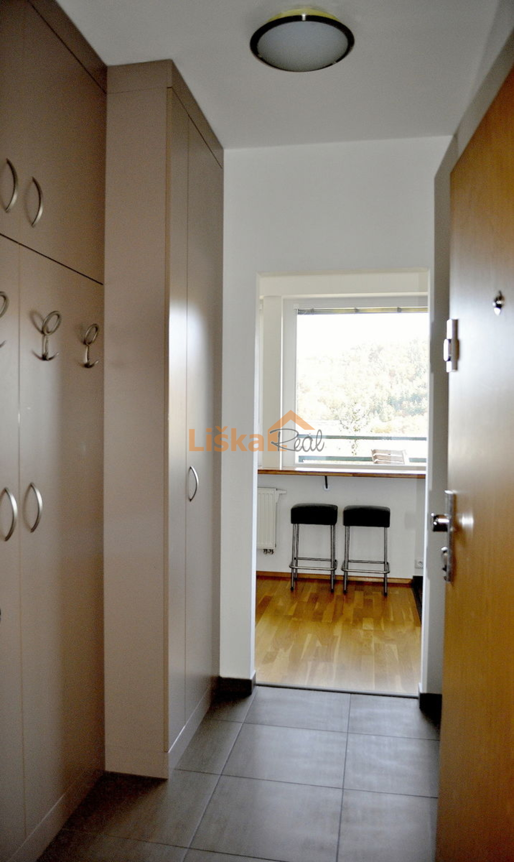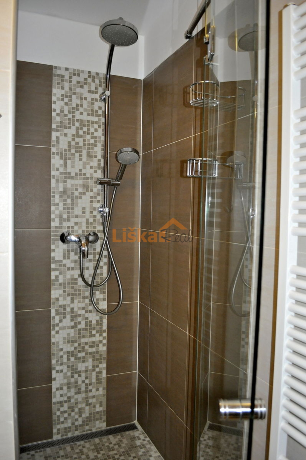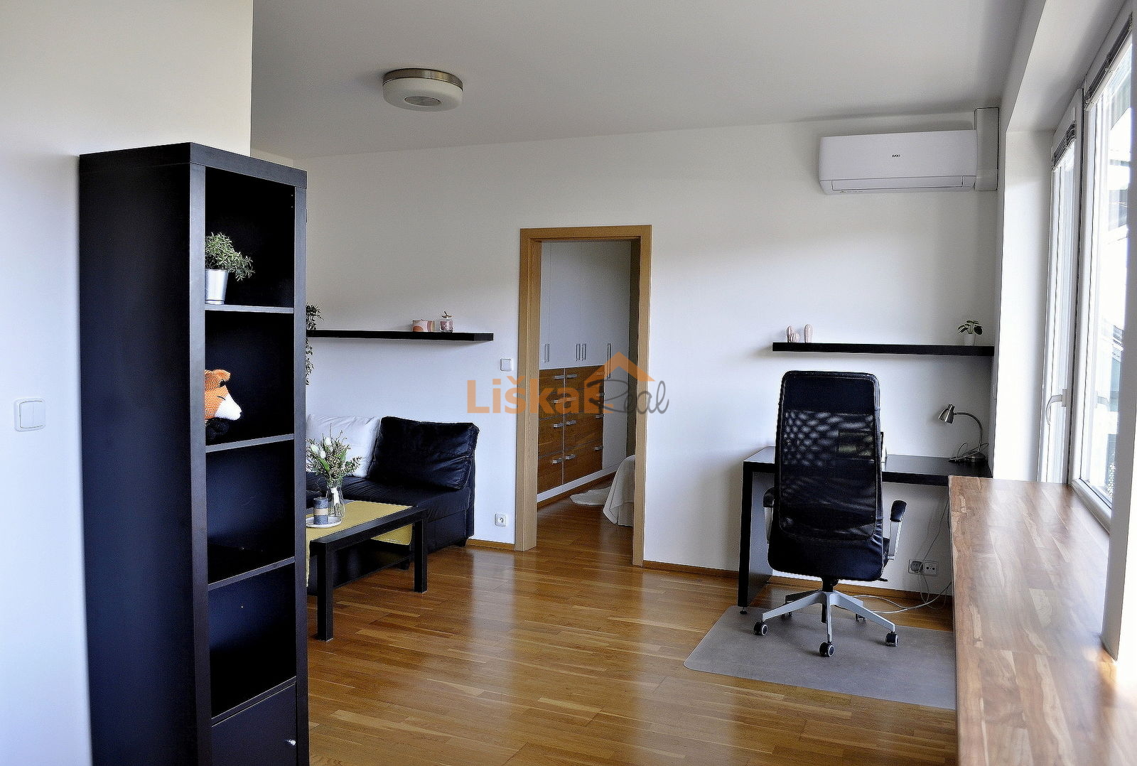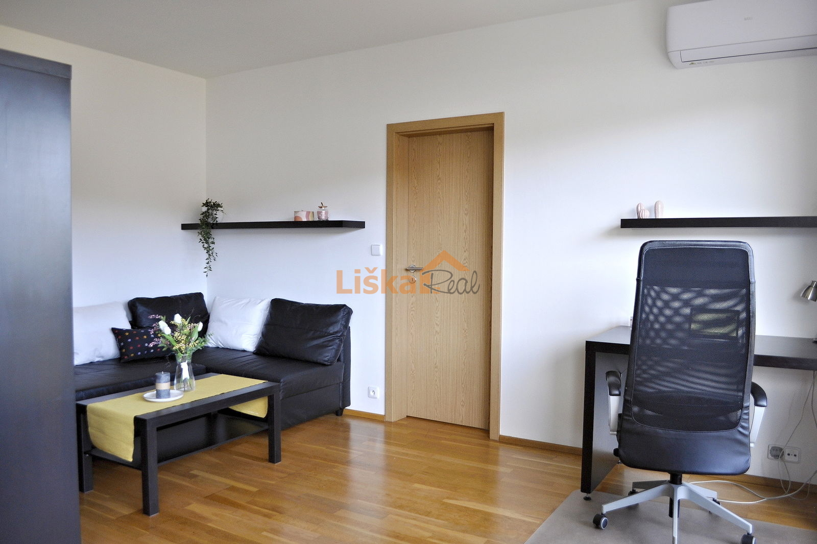 Dispozice bytu 2+kk nabízí vstupní chodbu, neprůchozí ložnici (13,4 m2), obývací pokoj propojený s kuchyní (22 m2) se vstupem na prostornou lodžii, koupelnu zařízenou zděným sprchovým koutem, koupelnovou skříňkou s umyvadlem, pračkou a závěsným WC. Kuchyně je vybavena kuchyňskou linkou v moderním a účelném provedení. Vyniká dostatkem úložného prostoru. Disponuje indukční varnou deskou, pečící troubou s mikrovlnkou, digestoří, myčkou nádobí, lednicí s mrazákem. Okna v bytě jsou plastová (nechybí stínící žaluzie, sítě proti hmyzu a zatemňovací rolety na střešních oknech) a prosvětlují celý byt. Podlahy v bytě jsou sjednoceny do světlého odstínu a jsou kombinací dřevěné podlahy a dlažby. Interiérové dveře včetně zárubní ladí s bílou výmalbou. Vytápění bytu je centrální. Pro komfort v letních měsících je k dispozici klimatizace. Vyúčtování energií dle samostatných měřičů. K bytu náleží zděný sklep. Samozřejmostí je možnost využívání vysokorychlostního internetového připojení. Parkování je umožněno na parkovišti naproti domu nebo v jeho blízkosti.