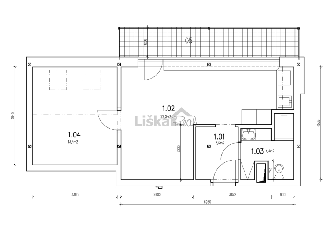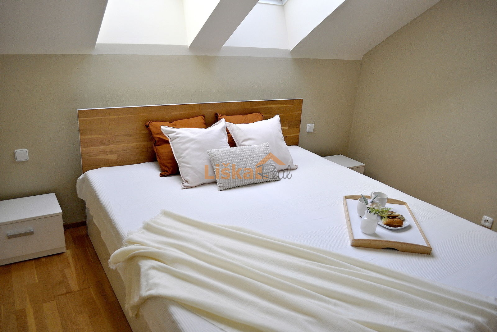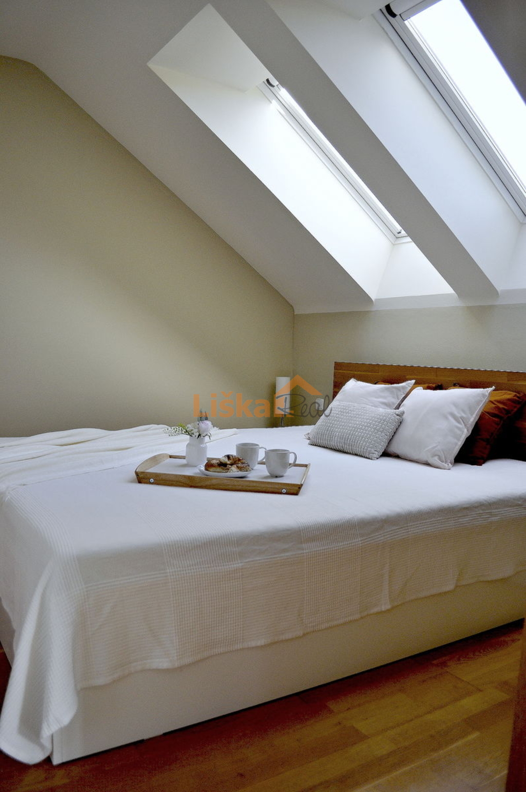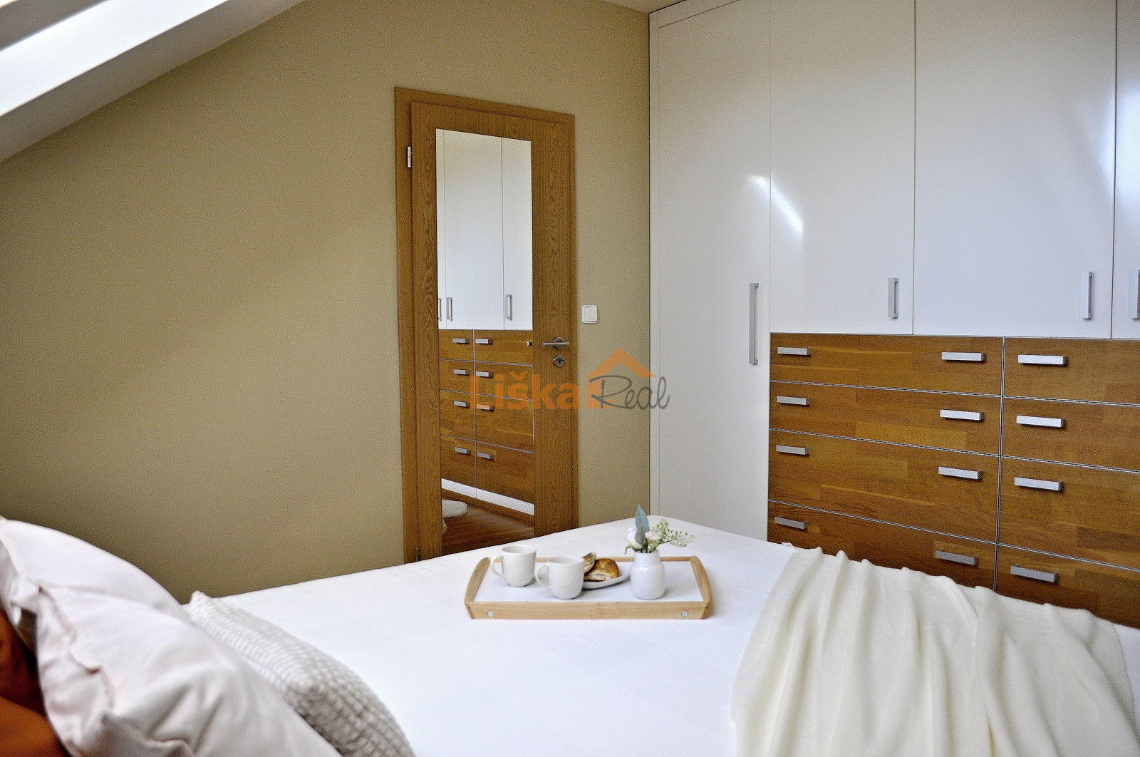 Dispozice bytu 2+kk nabízí vstupní chodbu, neprůchozí ložnici (13,4 m2), obývací pokoj propojený s kuchyní (22 m2) se vstupem na prostornou lodžii, koupelnu zařízenou zděným sprchovým koutem, koupelnovou skříňkou s umyvadlem, pračkou a závěsným WC. Kuchyně je vybavena kuchyňskou linkou v moderním a účelném provedení. Vyniká dostatkem úložného prostoru. Disponuje indukční varnou deskou, pečící troubou s mikrovlnkou, digestoří, myčkou nádobí, lednicí s mrazákem. Okna v bytě jsou plastová (nechybí stínící žaluzie, sítě proti hmyzu a zatemňovací rolety na střešních oknech) a prosvětlují celý byt. Podlahy v bytě jsou sjednoceny do světlého odstínu a jsou kombinací dřevěné podlahy a dlažby. Interiérové dveře včetně zárubní ladí s bílou výmalbou. Vytápění bytu je centrální. Pro komfort v letních měsících je k dispozici klimatizace. Vyúčtování energií dle samostatných měřičů. K bytu náleží zděný sklep. Samozřejmostí je možnost využívání vysokorychlostního internetového připojení. Parkování je umožněno na parkovišti naproti domu nebo v jeho blízkosti.