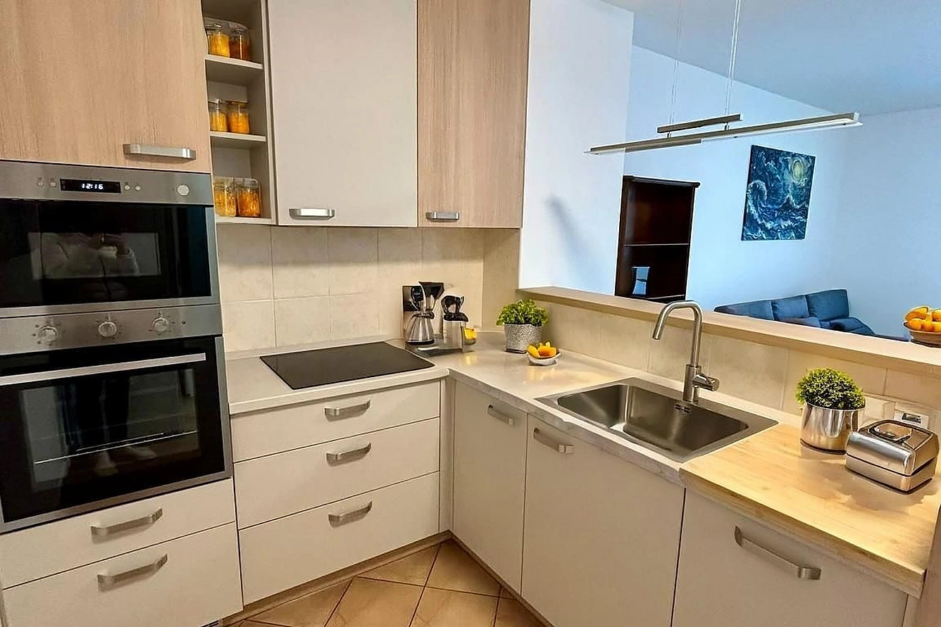 • plně vybavená kuchyňská linka (indukční deska, trouba, mikrovlnná trouba, myčka, nádobí)