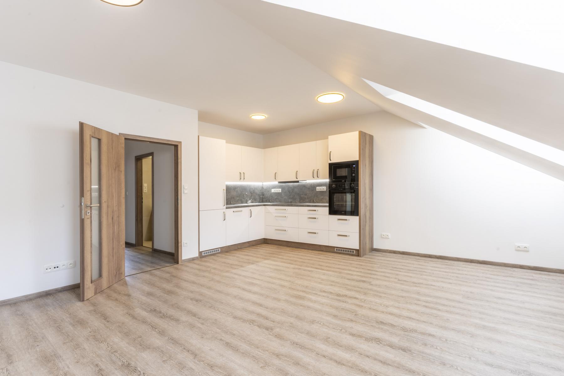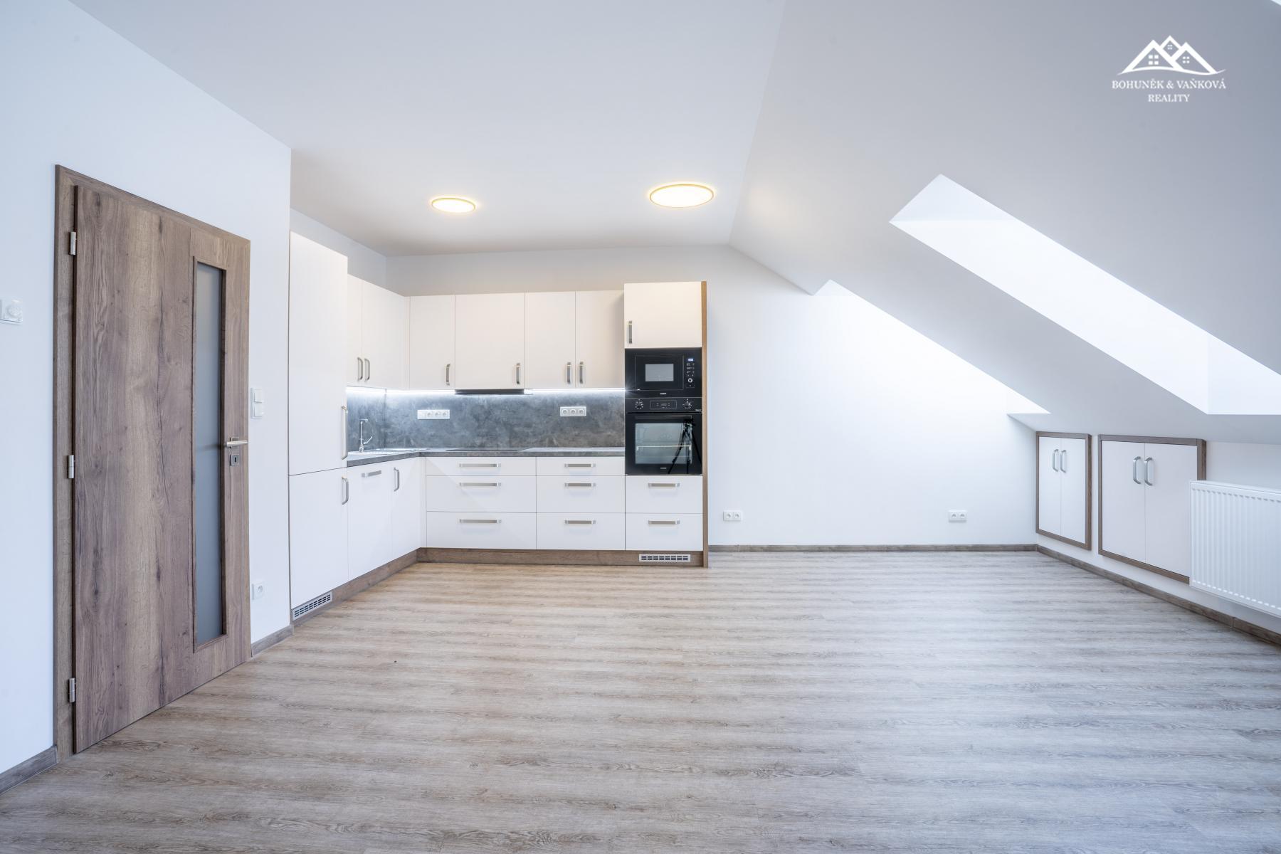 Byt je částečně vybavený kuchyňskou linkou s indukční varnou deskou, myčkou nádobí, lednicí.