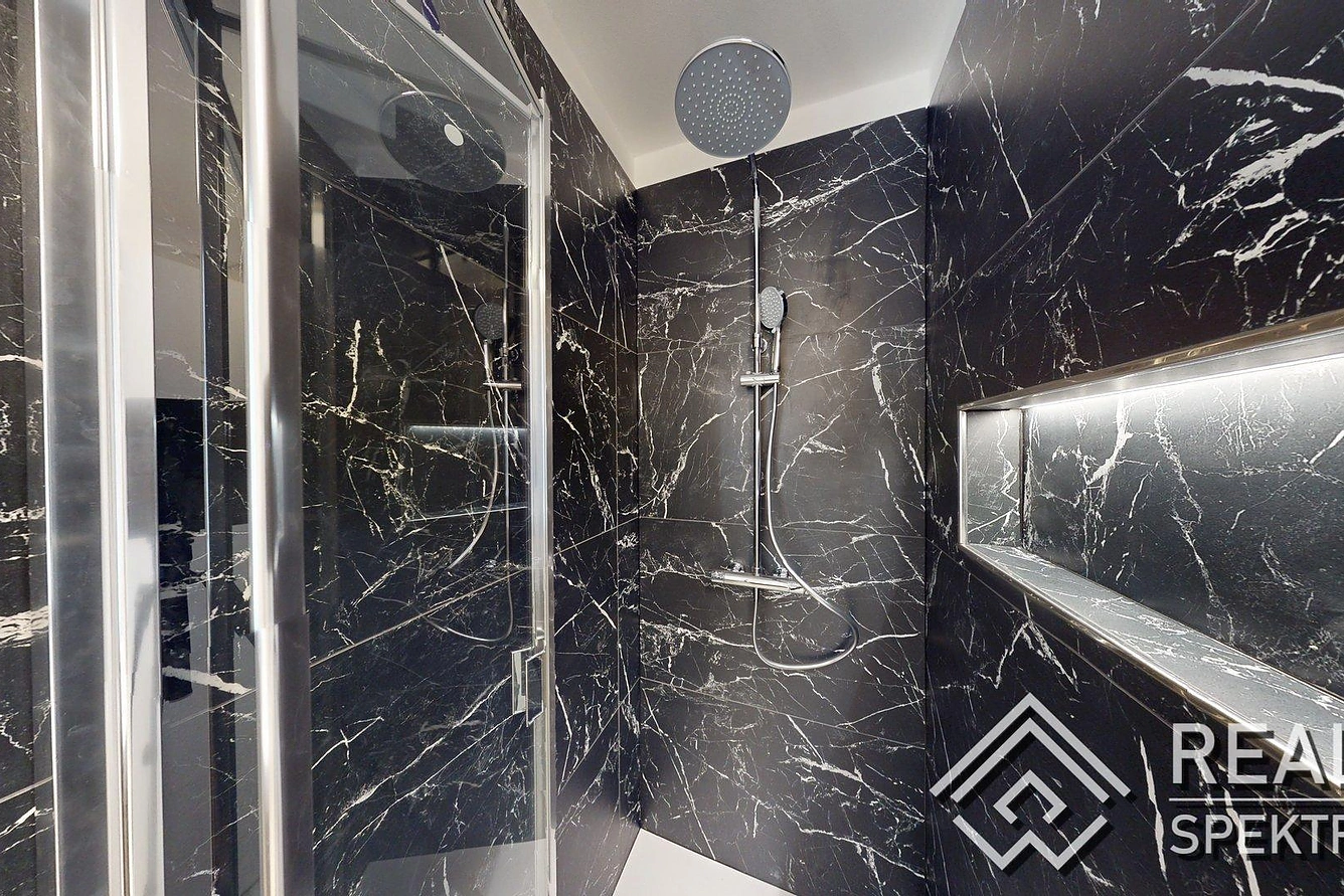 • Koupelna: Luxusně zpracovaná s elegantním sprchovým koutem, který je vybaven osvětlenou nikou. Nechybí ani otopný elektrický žebřík.