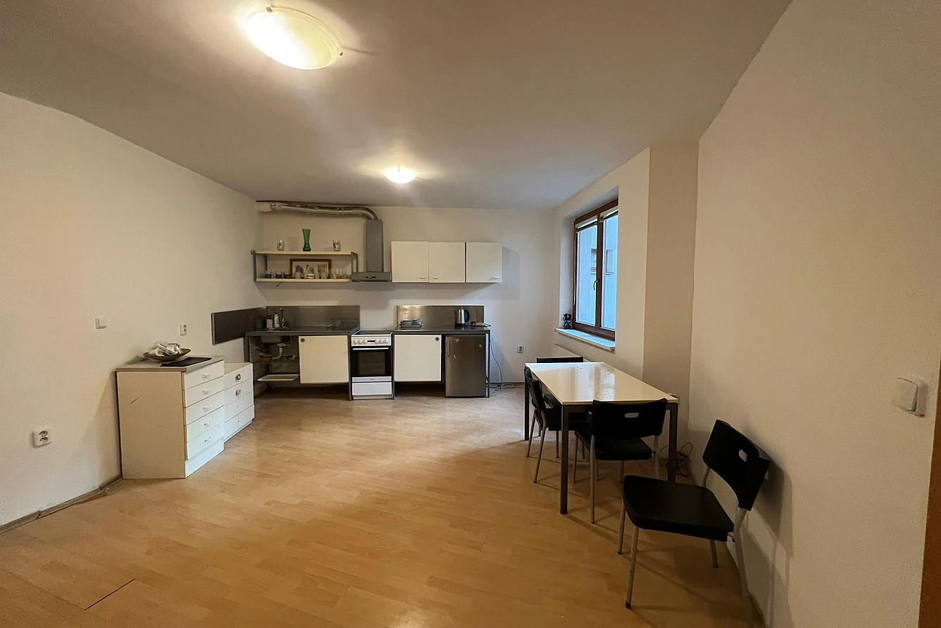 Byt je částečně zařízen nábytkem a vybaven základními spotřebiči (kuchyňská linka, sporák, lednice). Dispozice nabízí světlý obývací prostor s kuchyňským koutem a samostatnou ložnici.