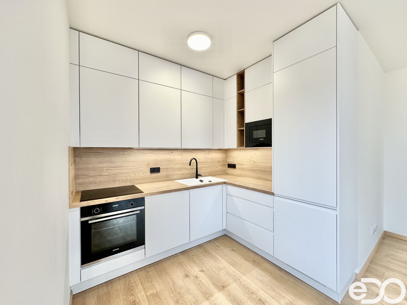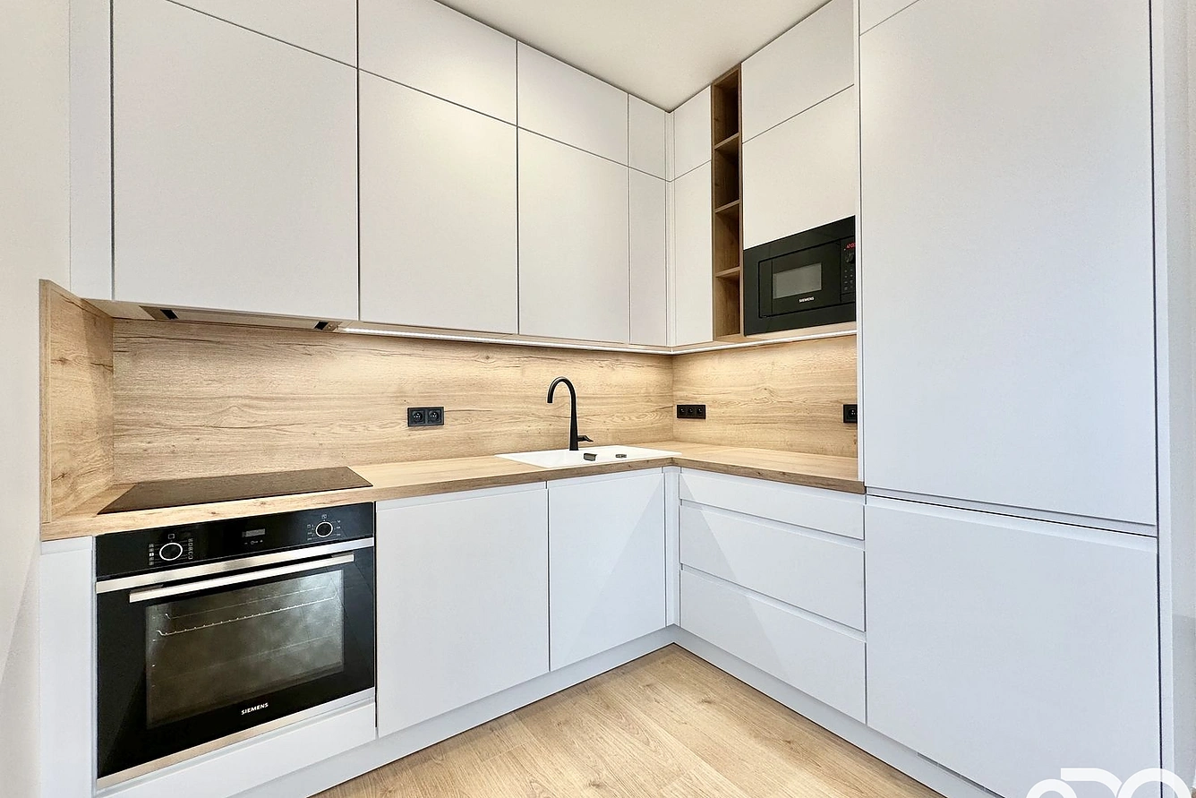 Bytová jednotka o celkové užitné ploše 62,9 m² je neobydlená a nachází se v 5. podlaží skeletové řadové novostavby. Užitná plocha bytu, tedy plocha obytných místností uvnitř vnějších stěn nemovitosti, je 51,2 m². Skládá se z velké předsíně s novou vestavěnou skříní na míru, ložnice, obývacího pokoje s novou kuchyní na míru, koupelny s vanou a umyvadlem, samostatného WC a prostorného balkonu (7,4 m²), který je přístupný z obývacího pokoje. Byt je orientovaný na severozápad. Co se týče spotřebičů, tak kuchyně disponuje indukční varnou deskou s digestoří, vestavěnou myčkou, mikrovlnnou troubou, elektrickou troubou a lednicí s mrazákem. Vše značky Siemens. K bytové jednotce dále náleží velký zděný sklep (4,3 m²) a garážové parkovací stání. Další garážová stání lze dopronajmout. Je zde také možnost využívat kočárkárnu, kolárnu či speciální místnost na mytí kol.