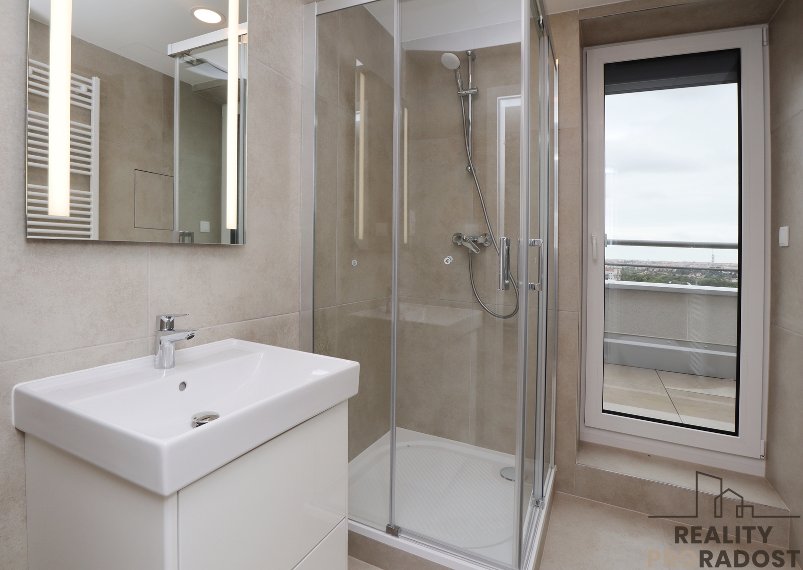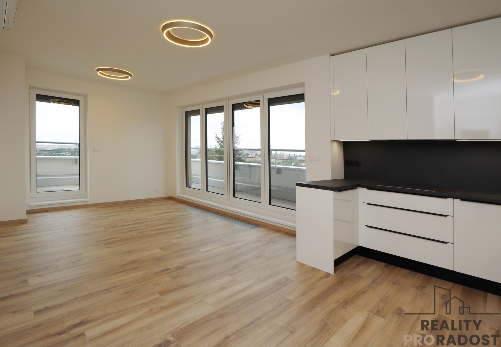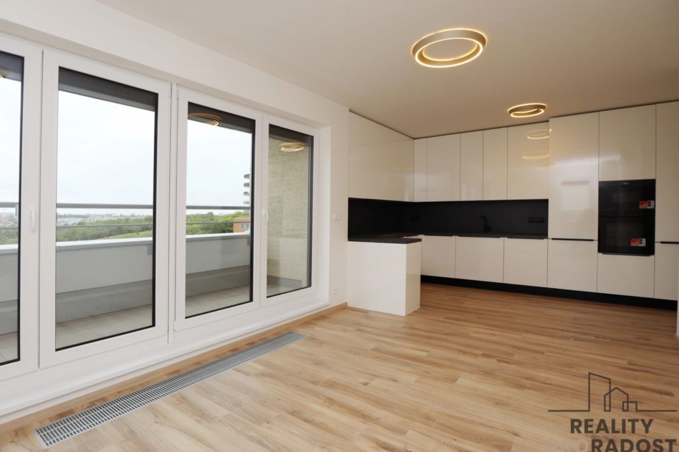 Moderní kuchyňská linka je vybavena elektrickou troubou, varnou deskou, lednicí s mrazákem, myčkou a mikrovlnkou. Kuchyně poskytuje dostatek úložného a pracovního prostoru. Z obývacího pokoje, ložnice i koupelny se vchází na terasu s krásným výhledem do okolí. Velká okna v bytě poskytují dostatek světla a hezký výhled do otevřeného prostoru. Na oknech jsou instalovány venkovní žaluzie na dálkové ovládání, byt je vybavený klimatizací. Podlahy jsou vinylové, v bytě je podlahové topení, v koupelně je umístěná pračka.