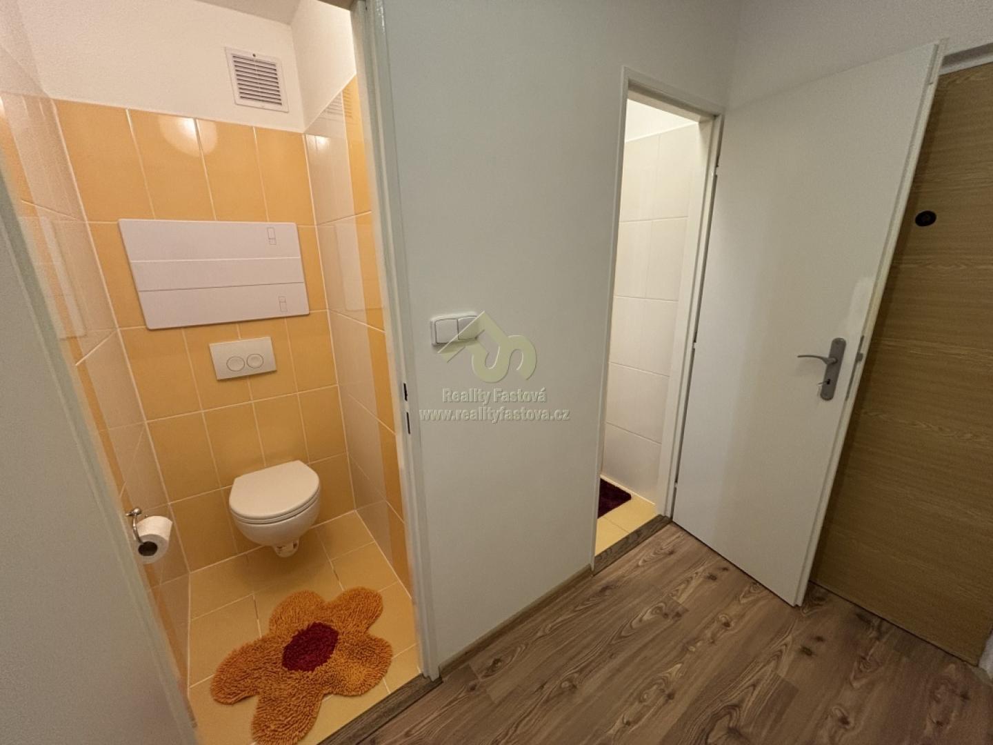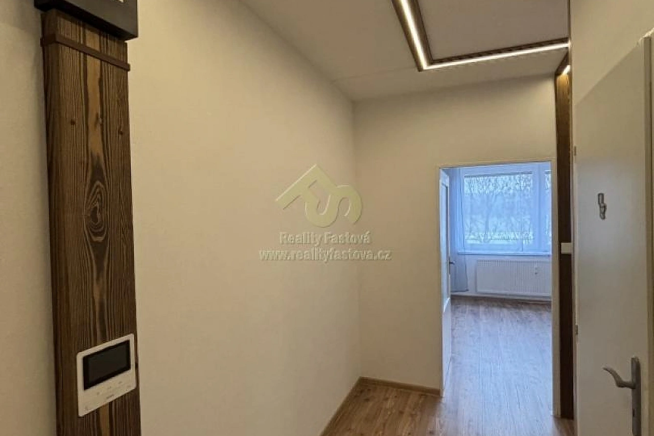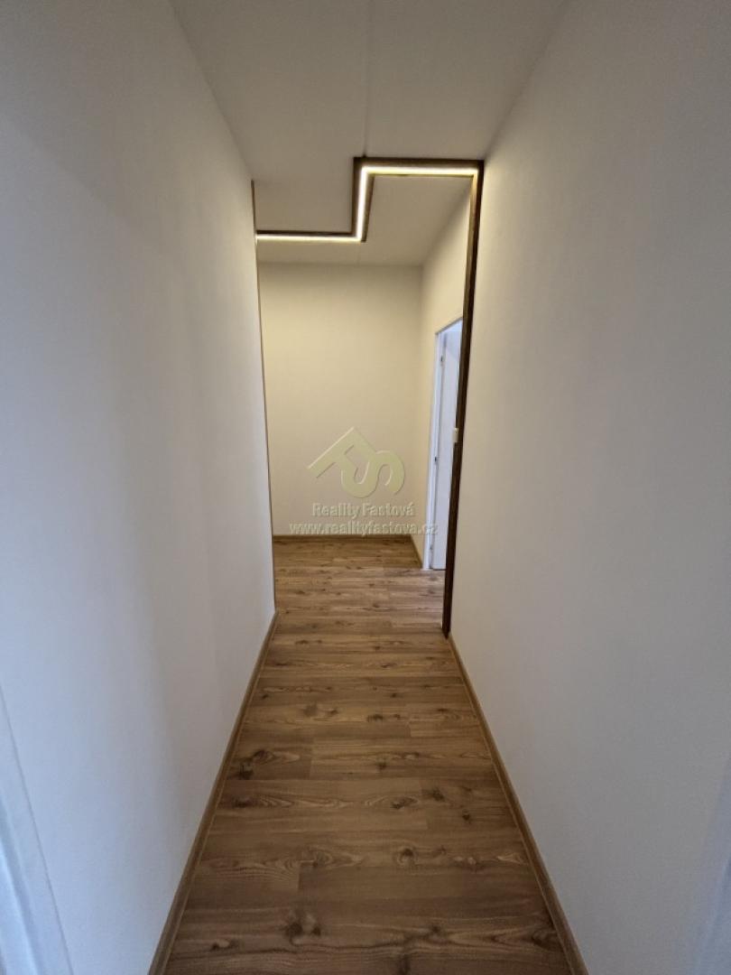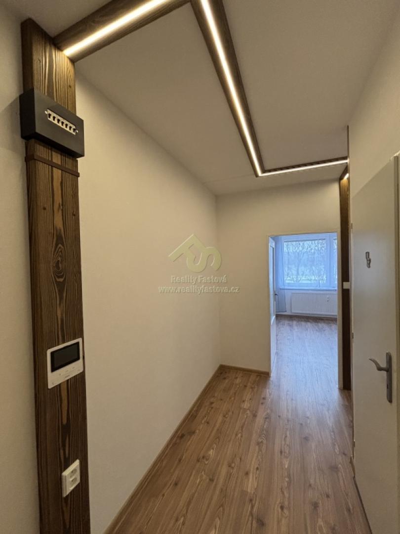 Vstupem do bytu vejdeme do prostorné chodby do tvaru „L“, napravo se nachází zděné jádro se samostatnou koupelnou, kde je osazen sprchový kout, umyvadlo a k dispozici je i pračka. Dále je zde samostatné WC. Z chodby je dále vstup do jednoho samostatného pokoje a dále následuje vstup do obývacího pokoje s kuch. koutem. Zde je k dispozici kuch.linka s novým sporákem s indukční varnou deskou a troubou, digestoří a lednicí s mrazákem. Obývací pokoj s kuch.koutem je jeden velký otevřený prostor, prosvětlený, útulný. V bytě jsou plastová okna vč. žaluzií, s parapety, nové rozvody vody a stupačky v plastu,atd.