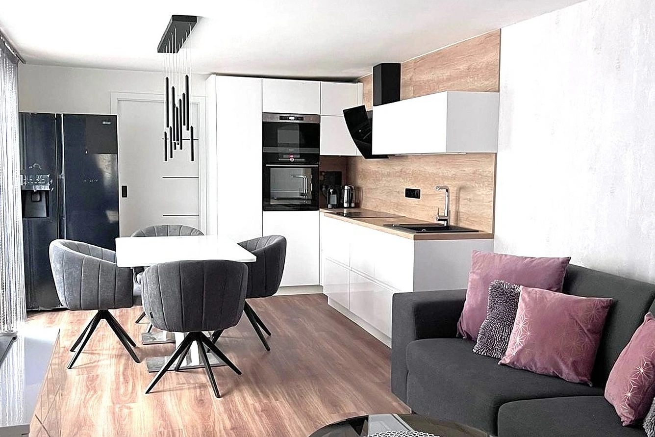V ložnici je k dispozici manželská postel s kvalitními matracemi a šatní skříň, v obývacím pokoji rozkládací pohovka a jídelní stůl. Kuchyň je vybavena troubou, indukční varnou deskou, mikrovlnnou troubou, myčkou a velkou americkou lednicí.