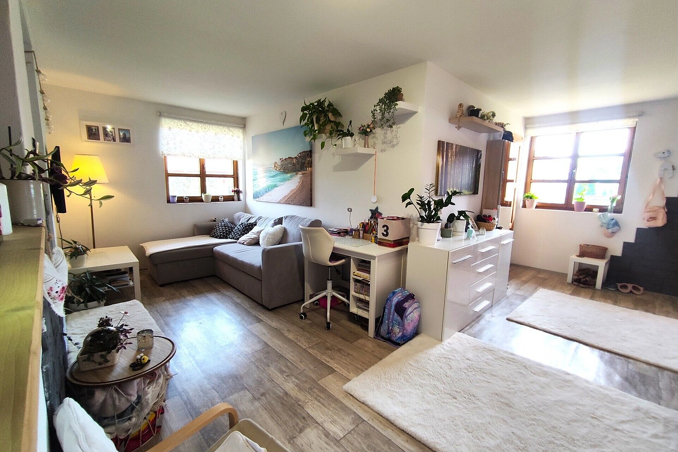 Byt se skládá z prostorného obývacího pokoje propojeného s kuchyní, která je kompletně vybavená kuchyňskou linkou se sporákem, lednicí a stolem se židlemi. Součástí kuchyně jsou také kamna s možností vytápění. Dále je zde ještě samostatná místnost využitelná jako ložnice, dětský pokoj, pracovna nebo hobby místnost. Koupelna je se sprchovým koutem a WC.