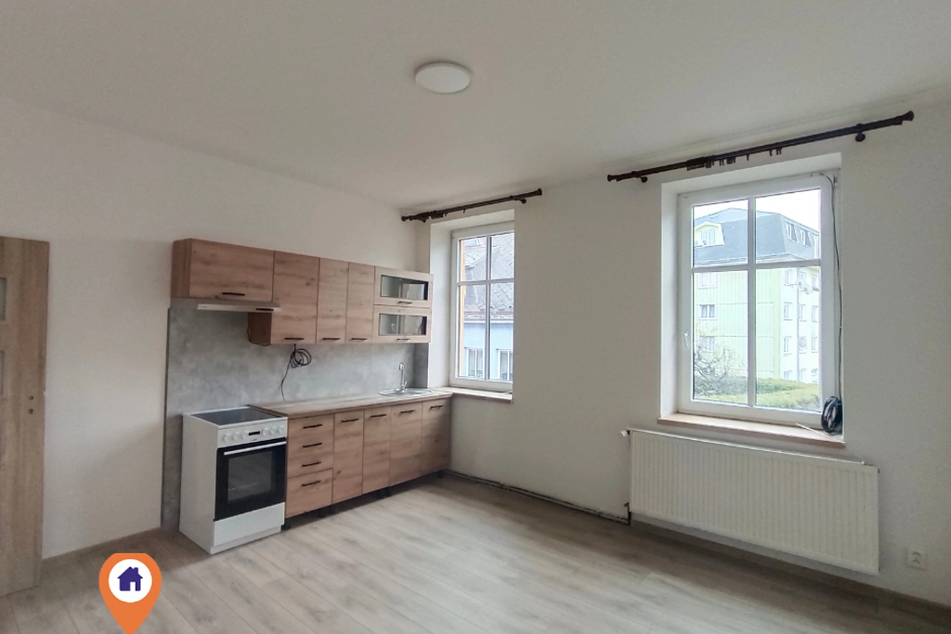 Byt se nachází v 1. NP cihlového domu a právě prošel kompletní rekonstrukcí. Najdete tu chodbu, koupelnu se sprchovým koutem a toaletou, menší pokoj vhodný jako ložnice či dětský pokoj a větší obývací prostor s novou kuchyňskou linkou a sporákem se sklokeramickou deskou.