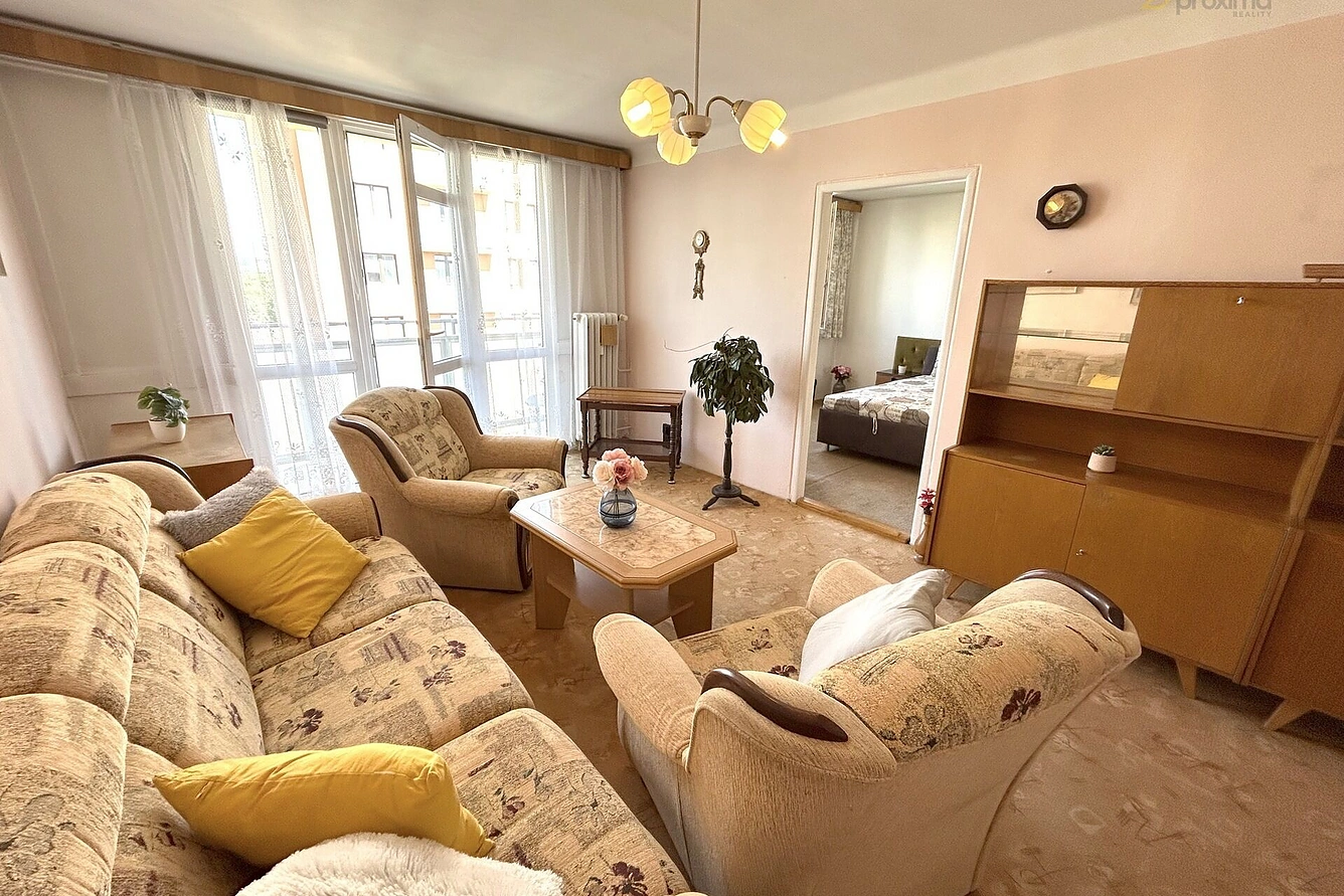 Bytová jednotka je v původním stavu a je řešena následovně: prostorná vstupní chodba, neprůchozí pokoj, WC s koupelnou, kuchyně, průchozí obývací pokoj s balkonem, ložnice. Byt je orientován na východ. K bytu náleží sklep v přízemí domu + možnost užívání kolárny. Byt se pronajímá ČÁSTEČNĚ vybavený.