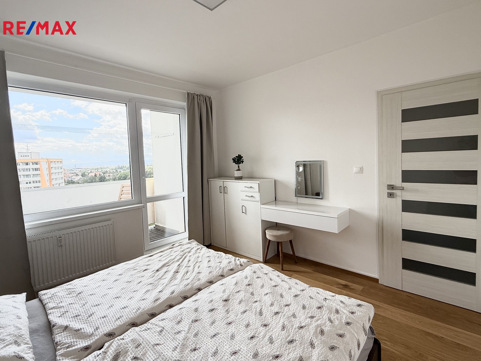 Byt je v sedmém patře (posledním) panelového domu, který se nachází ve svahu u přivaděče s výhledem z jedné strany na město a z druhé do zeleně.