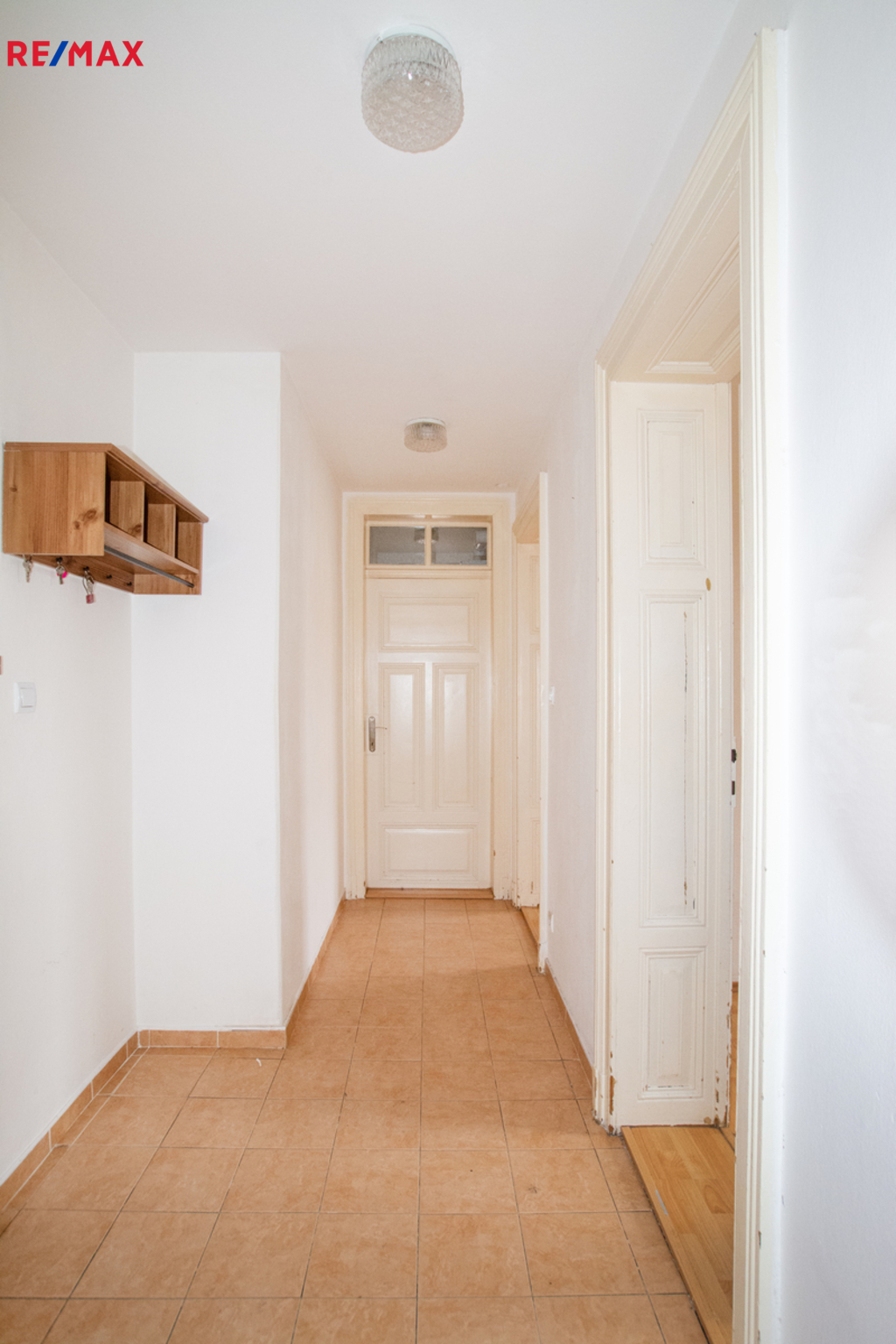 Z předsíně se vstupuje do prostorné kuchyně, která je v levé části bytu. Samostatné WC je také vlevo na konci chodby. V pravé části bytu se nachází menší pokoj, dále prostorný obývací pokoj s krbovými kamny, za ním ložnice a koupelna s vanou.