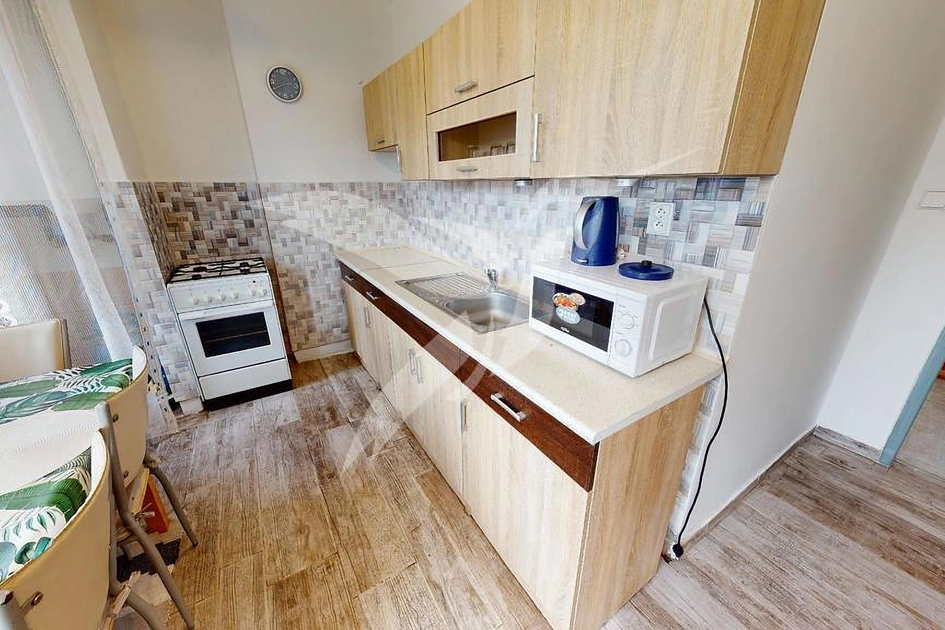 Nemovitost o velikosti 70 m2 se nachází v 2. NP cihlového domu bez výtahu a skládá se z předsíně a chodby, 3x samostatného pokoje, pokoje včetně kuchyňské linky, koupelny, toalety i komory na úložný prostor. Součásti vybavení je kuchyňská linka se spotřebiči (kombinovaný sporák, kombinovaná chladnička), dále jídelní stůl + židle, automatická pračka, šatní skříně. Vytápění zajišťují kamna na tuhá paliva a ohřev vody elektrický bojler.