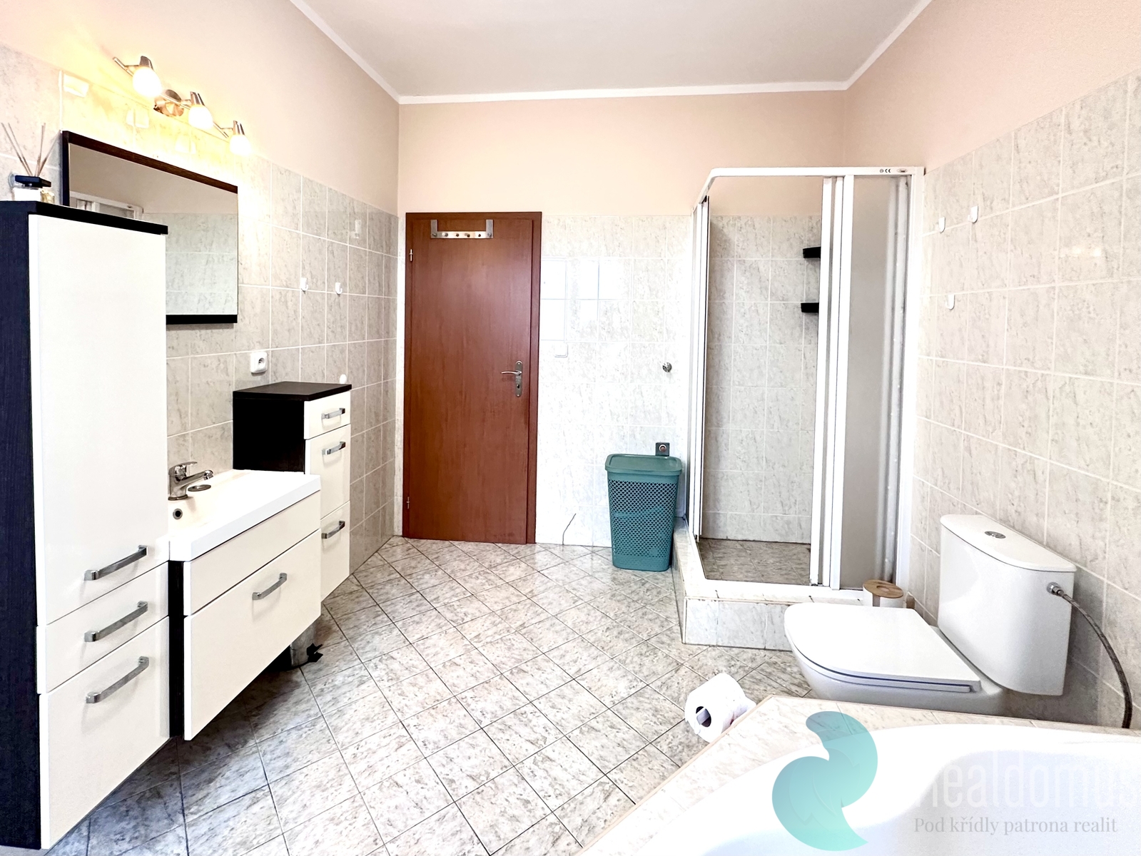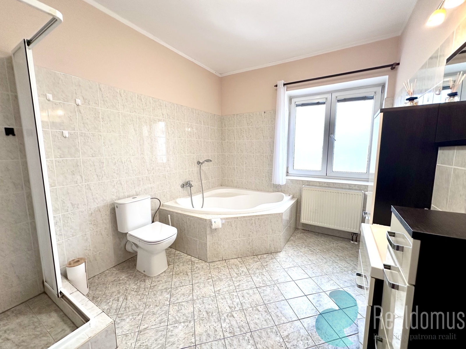 Velkou koupelnu s rohovou vanou i sprchovým koutem – ideální pro ty, kdo chtějí mít možnost rychlé sprchy i dlouhé relaxace.