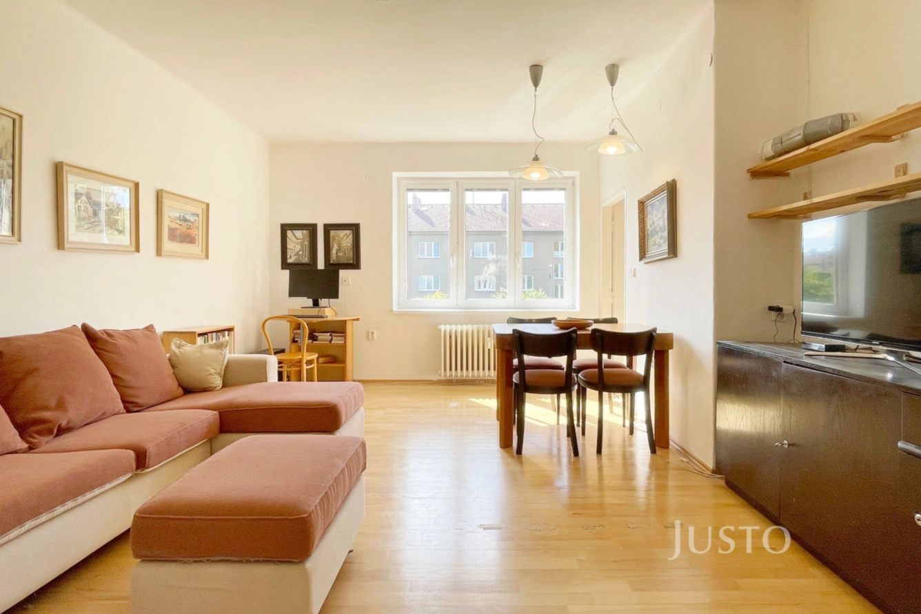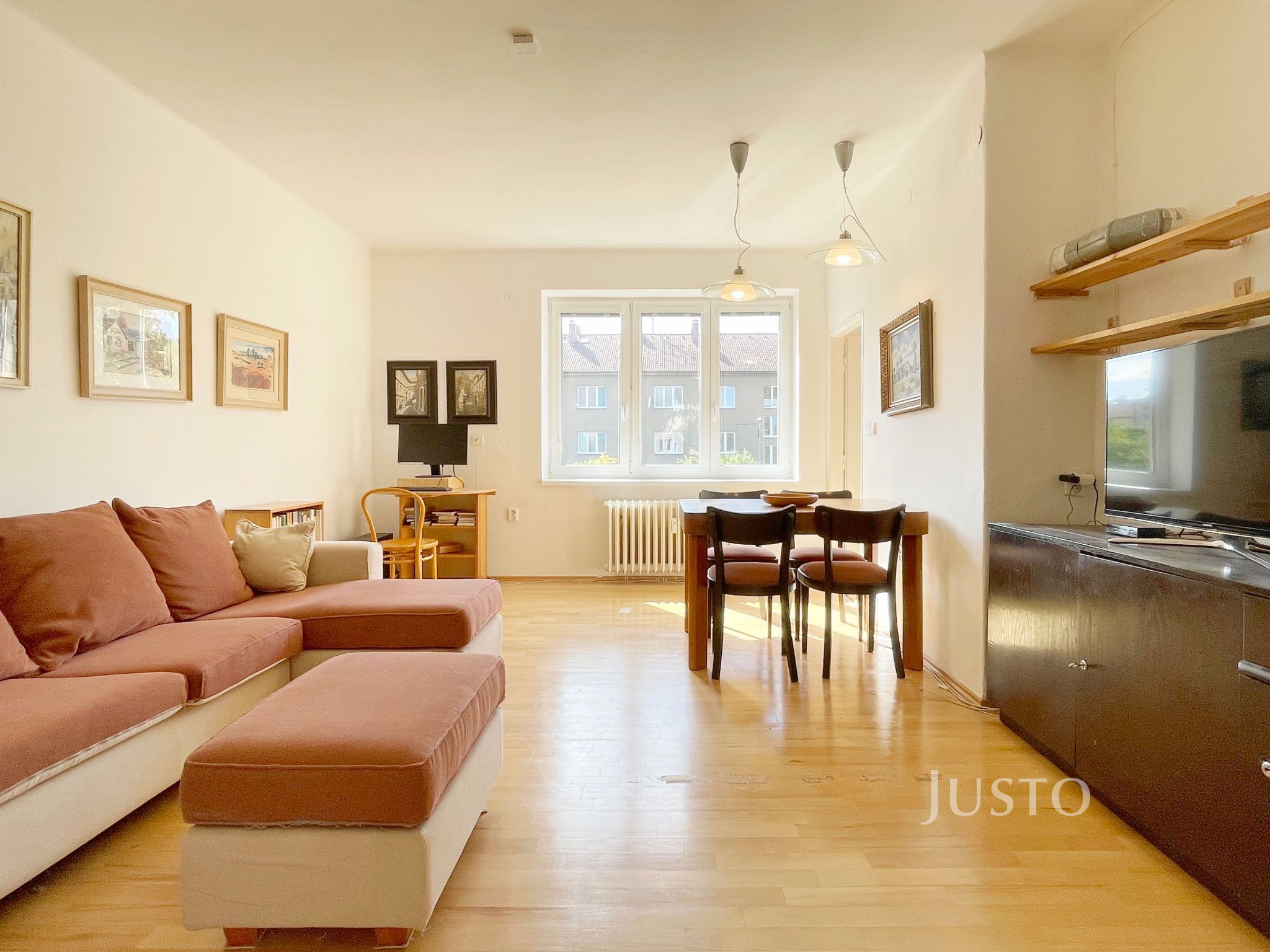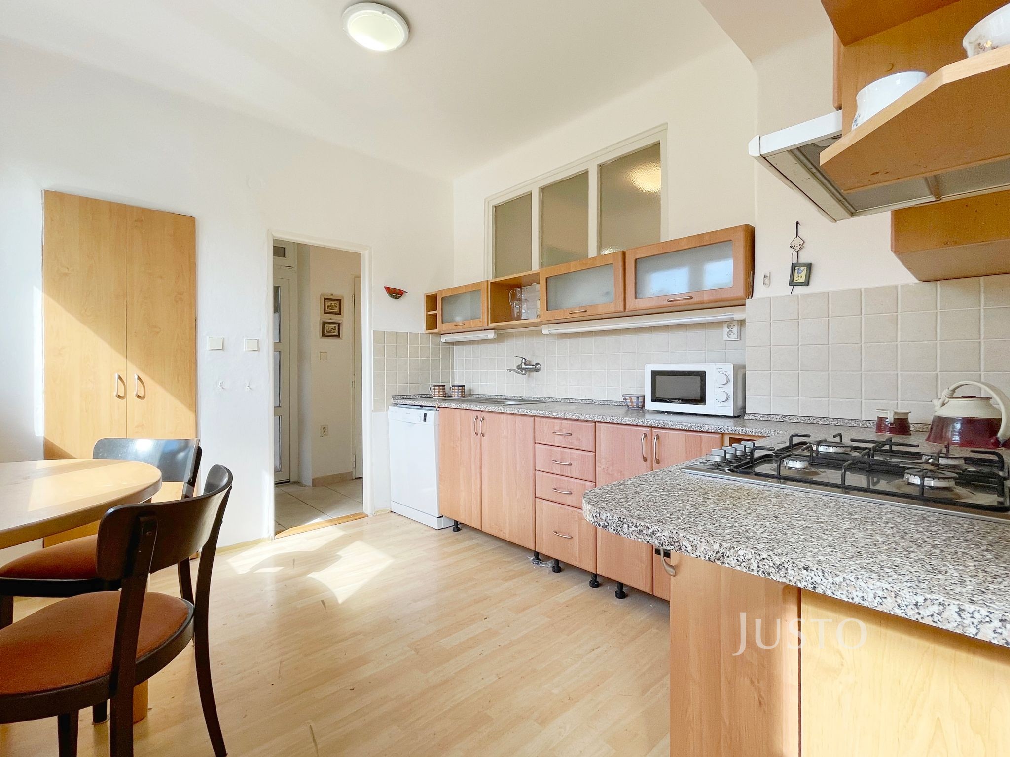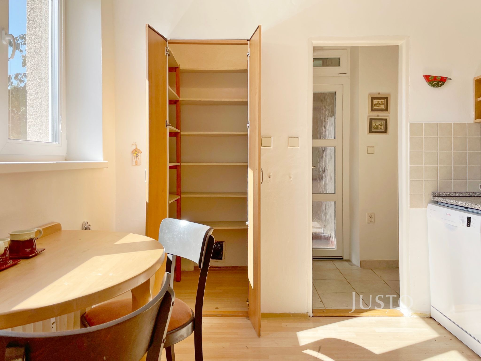 Byt nabízí, kromě prostorného obývacího pokoje, další dva samostatné obývací pokoje, prostornou vstupní chodbu s vestavěnými skříněmi a dostatek úložného prostoru v komoře, která je součástí bytu. K dispozici je rovněž sklep v suterénu domu a lodžie.