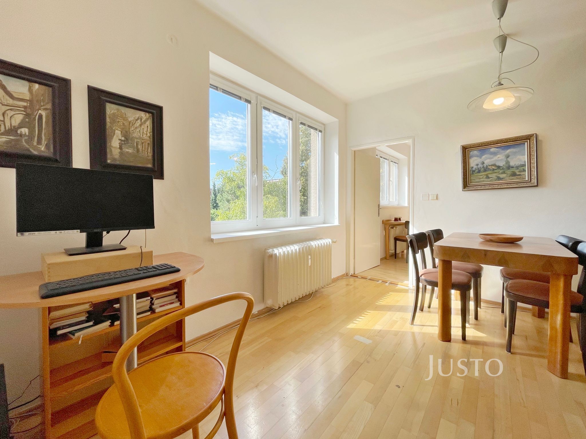 Dominantou bytu je světlý a vzdušný obývací pokoj s jídelním koutem, který plynule navazuje na kuchyň s dostatkem úložných prostor. Z oken je příjemný výhled do zeleně, což poskytuje dostatek klidu a soukromí.