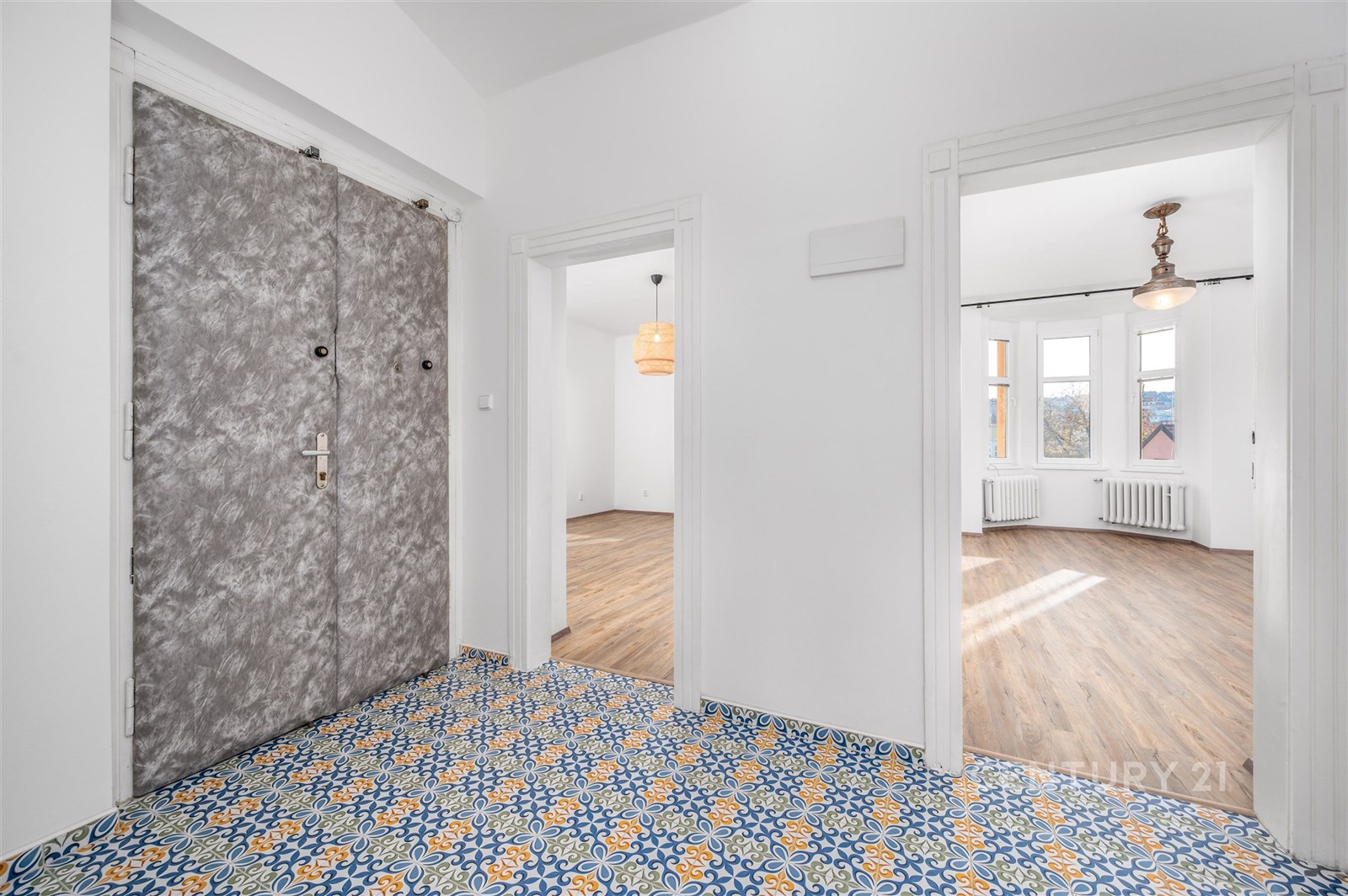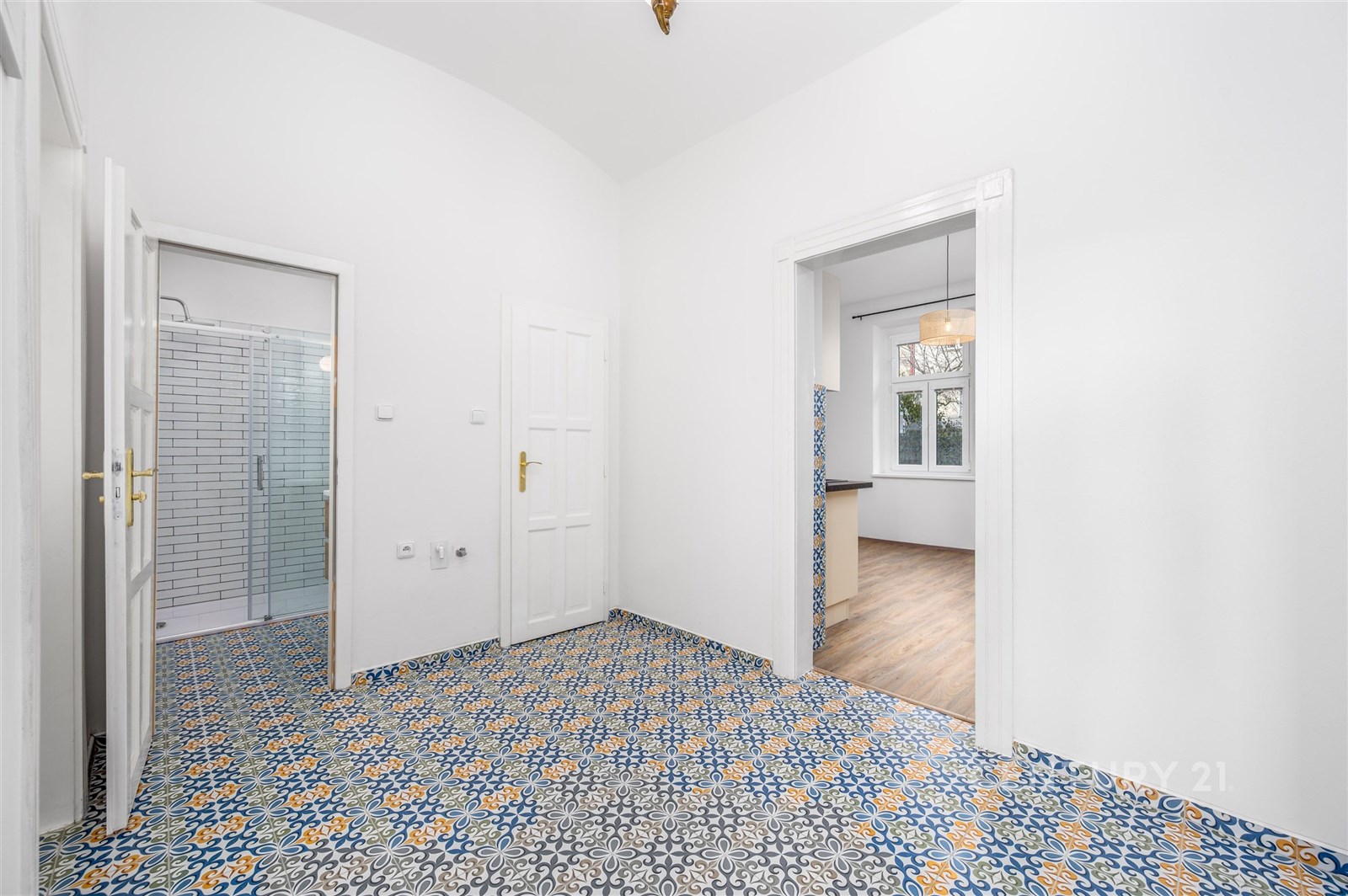 Byt s výměrou 90 m2 prošel letos kompletní, velmi pečlivou rekonstrukcí, která bytu vdechla nový život a zároveň zachovala několik střípků z jeho historie. Při vstupu vás přivítají původní dvoukřídlé kazetové dveře a pokojové dveře s nádhernými skleněnými vitrážemi, které okamžitě navodí pocit domova s duší. Stejně silný dojem zanechá i klenutý strop v předsíni – detail, který se dnes už téměř nevidí.
