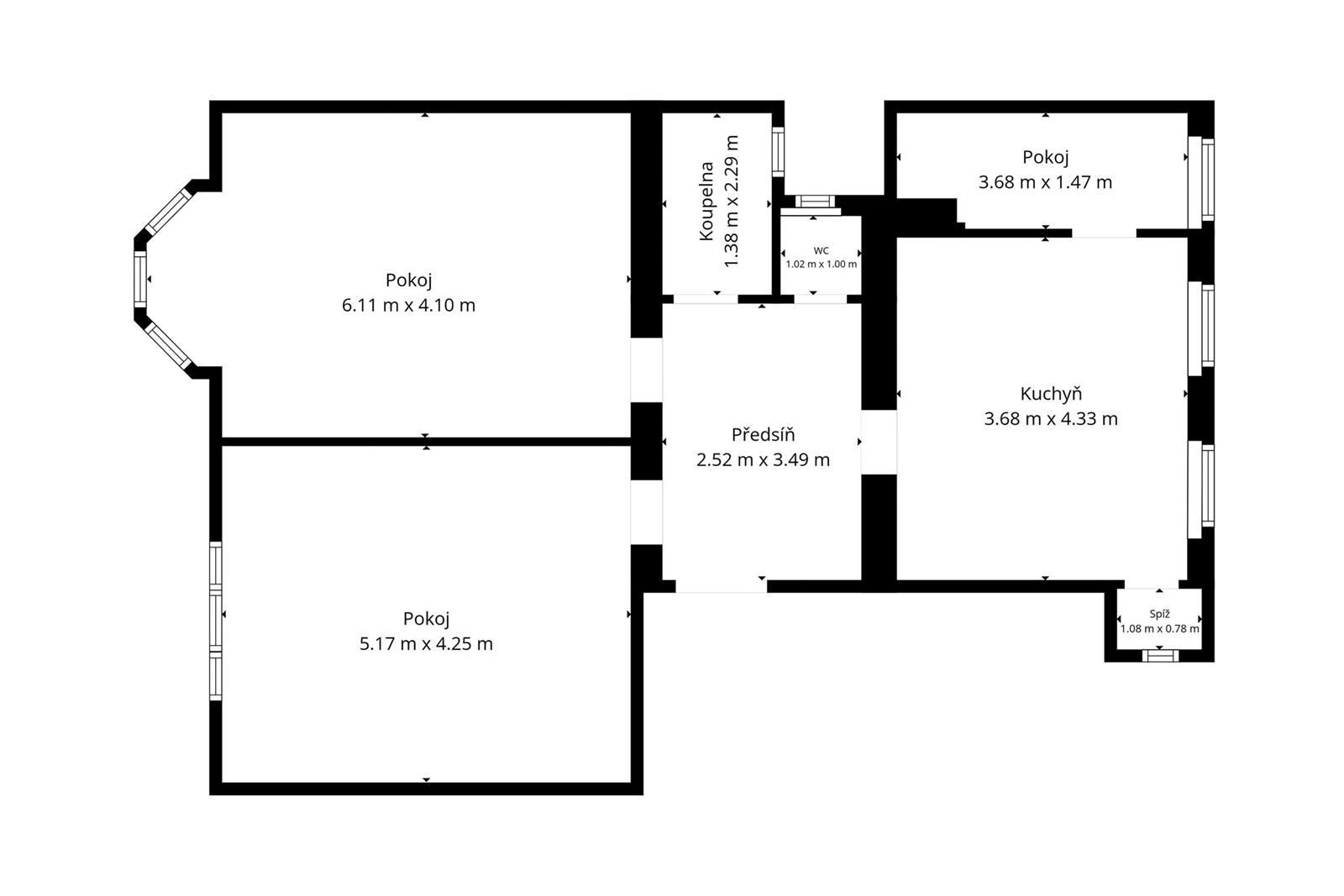 Dva velkorysé pokoje orientované na jih vás potěší množstvím světla i krásnými výhledy. Kuchyně a menší pokoj směřují do severní zahrady, kterou mohou užívat všichni obyvatelé domu. V menším pokoji zůstalo zachované původní dřevěné patro, které působí útulně a díky vysokým stropům dodává této nepatrné místnosti další rozměr. Praktická spíž je tu malým pokladem pro všechny, kdo rádi udržují pořádek.