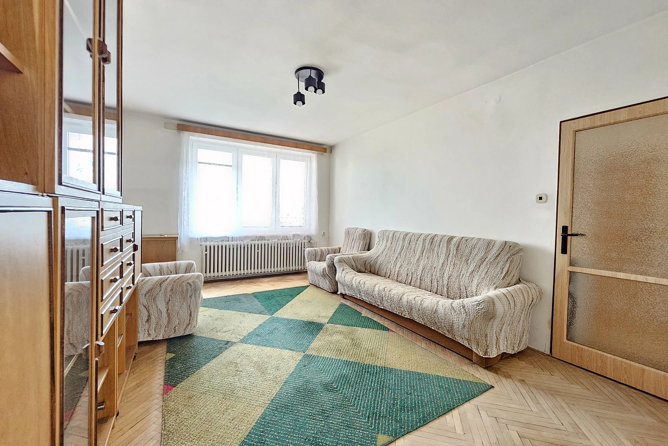 Dispozice bytu - vstupní prostorná chodba, koupelna, WC, prostorný obývací pokoj, kuchyň, ložnice a pokoj. Dále k bytu náleží prostorná sklepní kóje k uskladnění věcí.