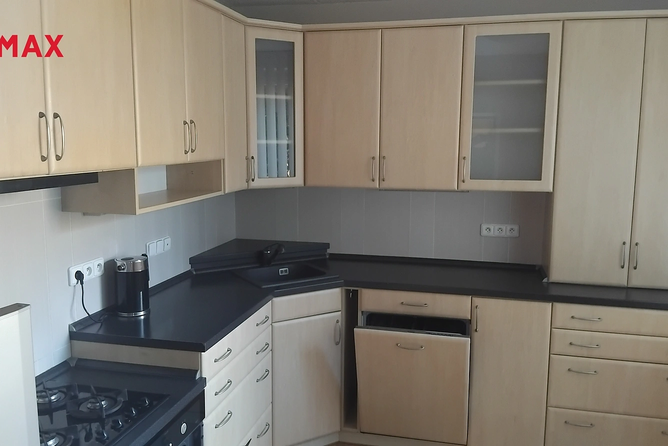 Kuchyňská linka s plynovým kombinovaným sporákem a elektrickou troubou, myčka nádobí.