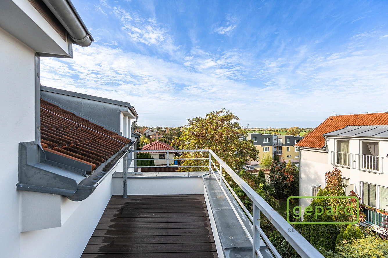 Celková plocha bytu činí 59 m2 včetně terasy (5,5 m2) a balkonu (2,5 m2). Byt je situován v 1. patře a v podkroví cihlového domu z roku 2006. Ve spodním patře bytu je obývací pokoj s kuchyňským koutem a vstupem na balkon (orientovaný na jihovýchod), předsíň a koupelna s toaletou. V horním patře jsou dva pokoje a koupelna s vanou. Z většího pokoje vede vstup na terasu, která je směrována na severozápad. V obytných místnostech je plovoucí podlaha, v předsíni a v koupelně je dlažba. Schody jsou dřevěné s protiskluzovými nášlapy. Na oknech jsou dvojité garnýže. Byt je z větší části vybaven nábytkem a spotřebiči, jak je znázorněno na fotografiích. Součástí pronájmu je vybavení uvedené zde v textu. Kuchyňská linka obsahuje vestavnou lednici, sklokeramickou varnou desku, elektrickou pečící troubu a digestoř a dále volně stojící mikrovlnnou troubu. V obývacím pokoji je k dispozici jídelní stůl se 4 židlemi a pohovka, v pokoji trojdílná šatní skříň a v ložnici rám postele 200x180 cm včetně roštů a komoda. V předsíni je botník se zrcadlem. V koupelnách je koupelnový nábytek a pračka. Nájemce může využívat společnou zahradu se zahradním sezením. Parkovat lze volně na ulici, případně je možné zprostředkovat pronájem parkovacího stání na oploceném parkovišti u domu.